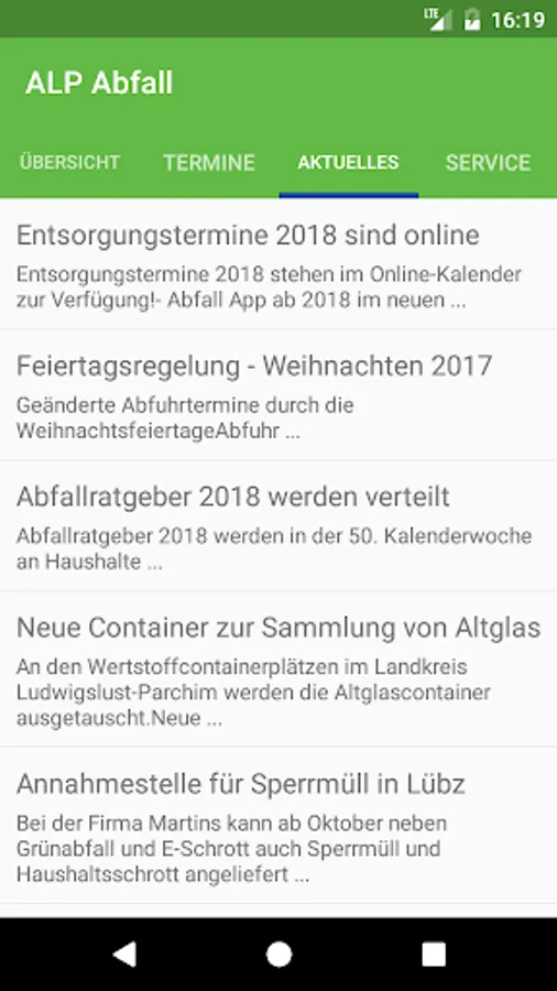 The collection dates for all collection systems in the Ludwigslust-Parchim district are available via this free app from the Ludwigslust-Parchim AöR (ALP AöR) waste management system. A look at the ALP Waste App provides information, for example, when the household garbage can is emptied again or when the mobile hazardous substance stops in your place of residence.