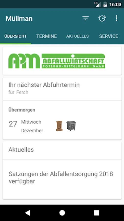The APM Müllman app also provides the latest information on the waste from the site of the APM GmbH as well as direct access to contacts, to sign up for the bulky waste and other ordering and reporting forms. Would you like such. be as additional recalls by e-mail to the impending removal dates, you go directly through the Müllman app to register the remembrance service.