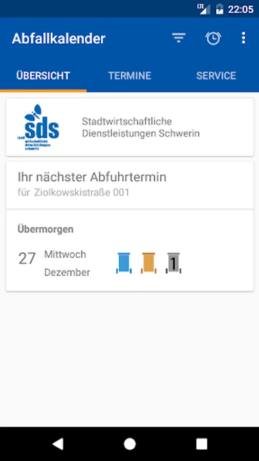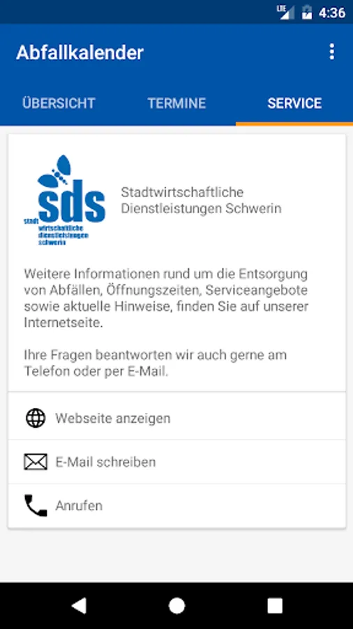 The free drop calendar app of the city Economic Services Schwerin provides information on the current discharge dates of the available in the city of Schwerin waste collection systems.