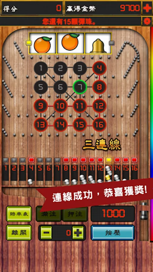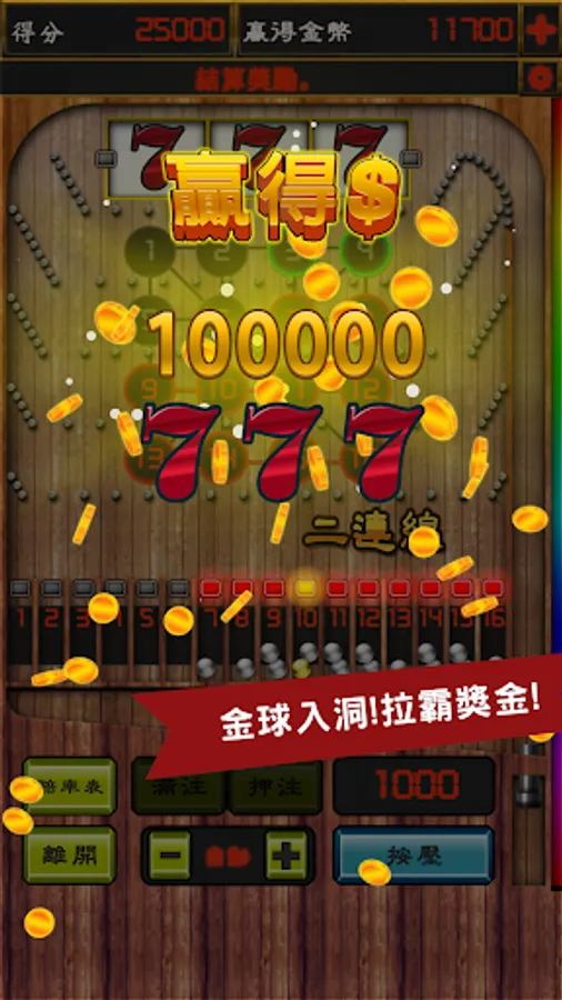 當您連線成功時,押注金額高達500點後,還會出現金洞及金球,將金球送入金洞後,還能額外獲得一次拉霸機會,有機會贏得超級大獎!您還在等什麼呢?趕快來下載這款賓果彈珠檯吧!