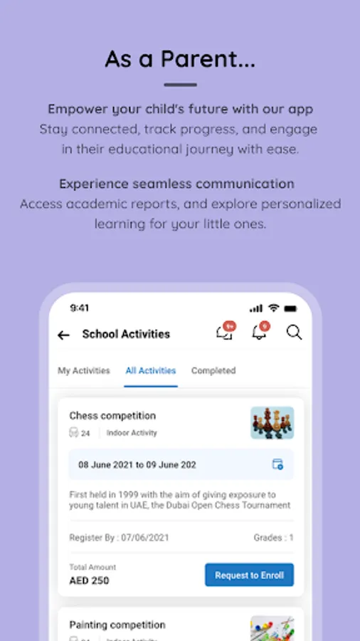 • Be notified about upcoming academic and extracurricular events and activities with our app.