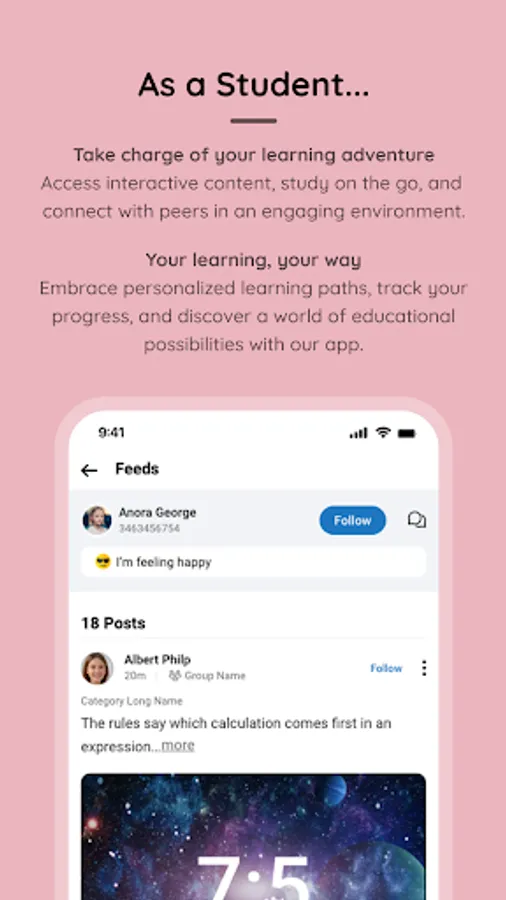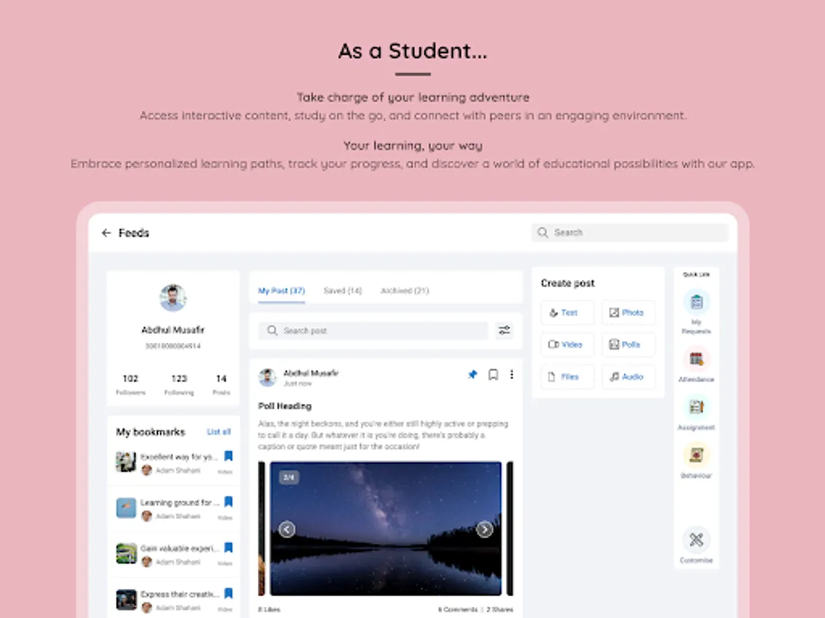 • Share unique ideas, suggestions and engage in discussions with teachers, students, parents using Feeds.