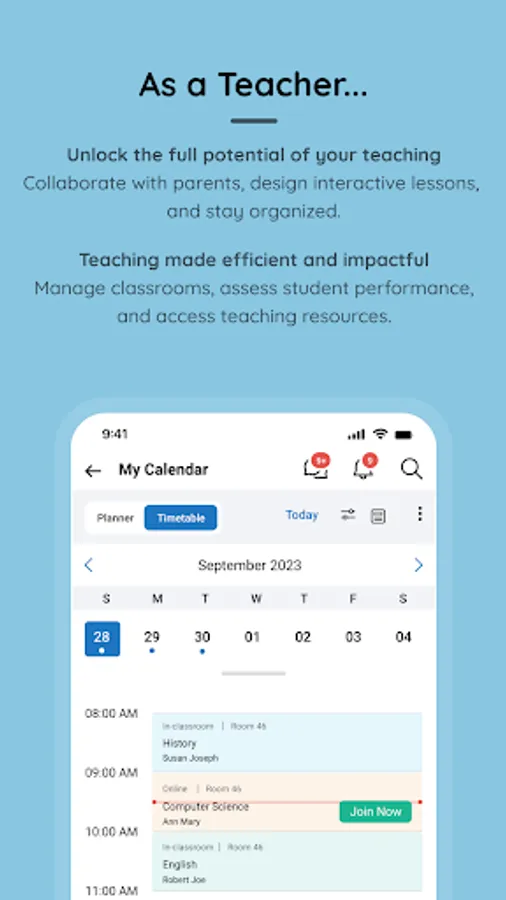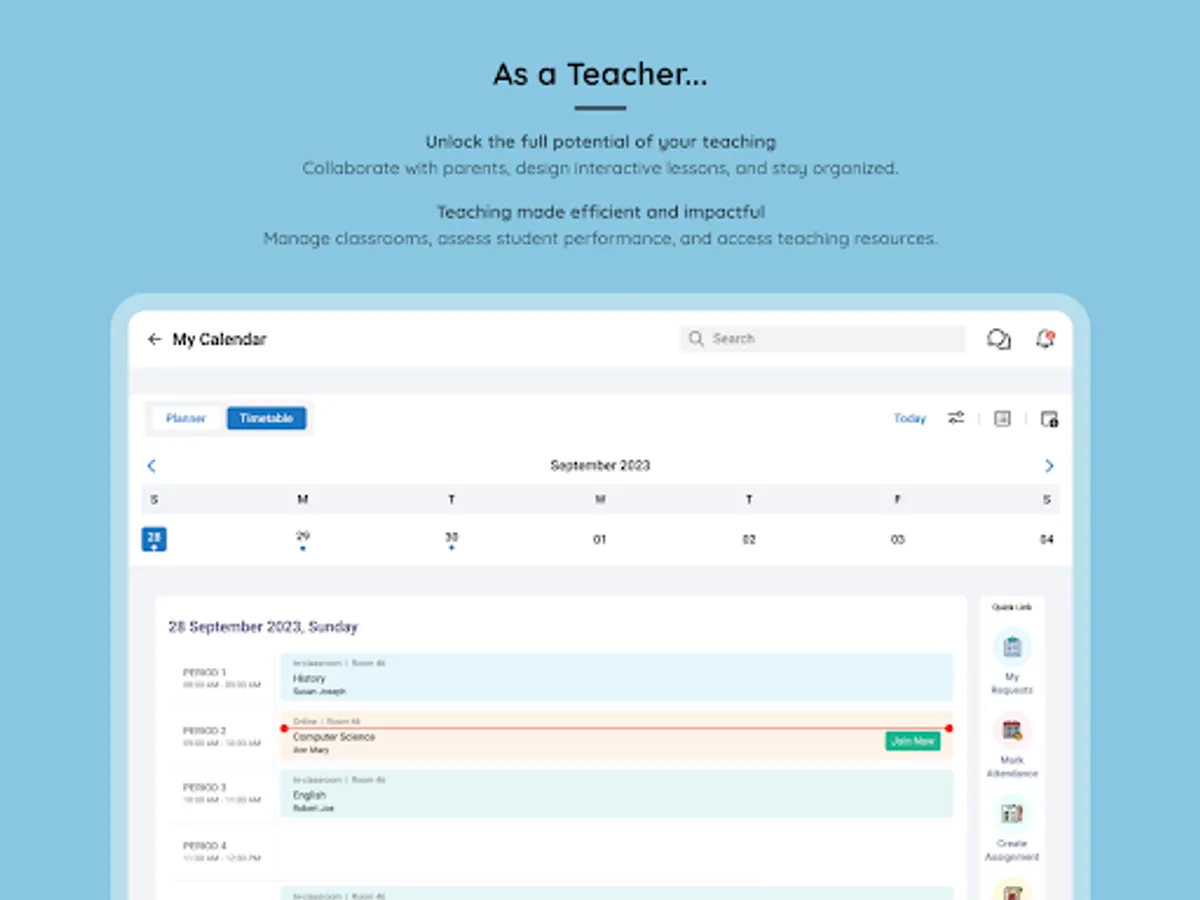 • Keep track of your classes, live sessions, and other school events with our app - and teachers can use it to mark attendance, track behaviour, and monitor academic progress.