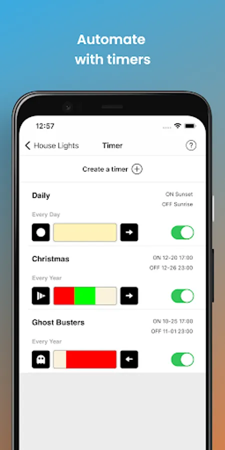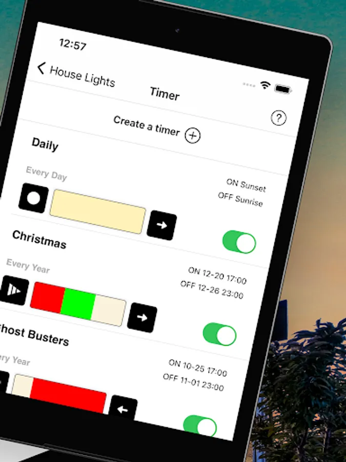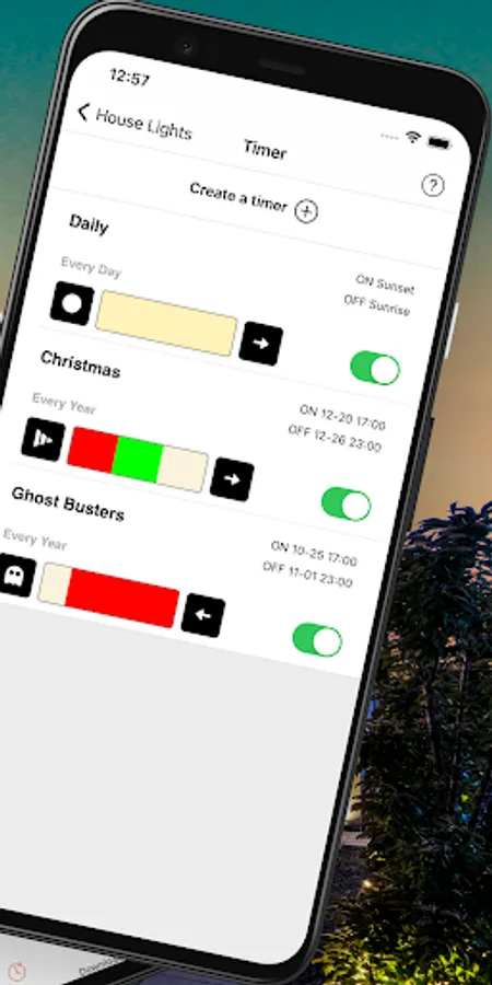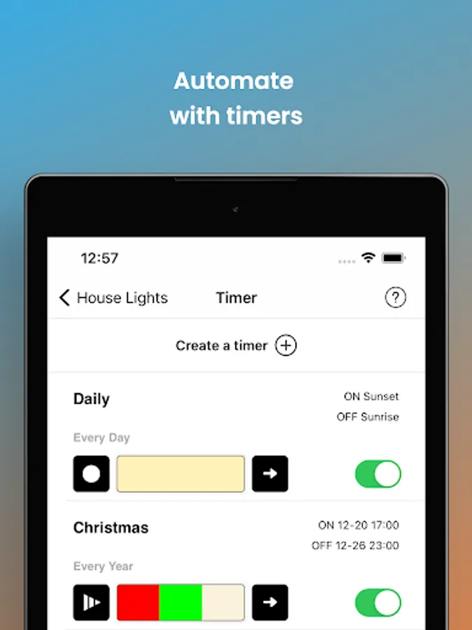 No need to buy external timers, Gemstone Lights App allows the user to program multiple timers. Repeat yearly for birthdays or change every hour of the day, you are in control of what colors and patterns turn on.