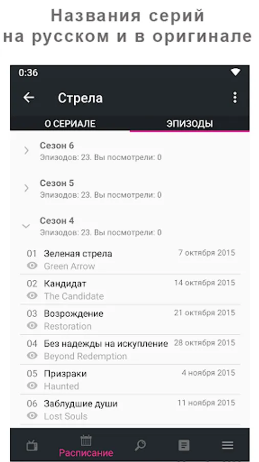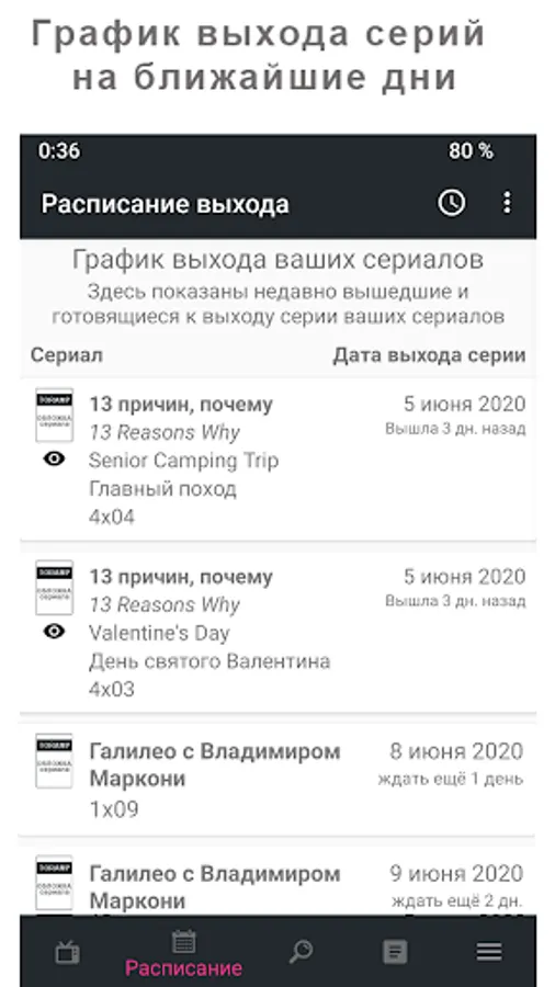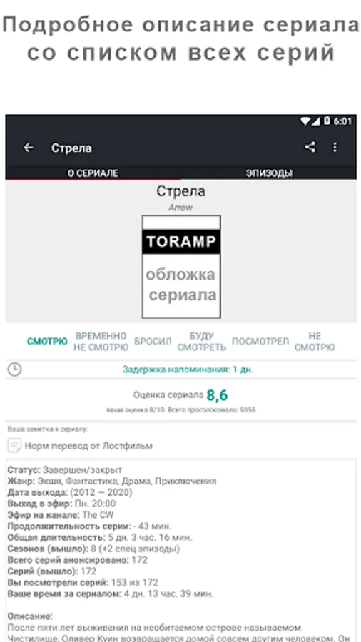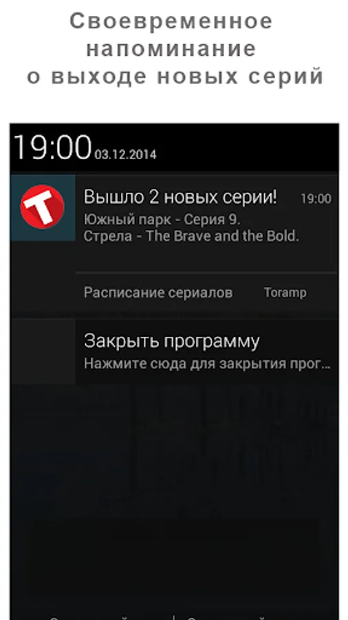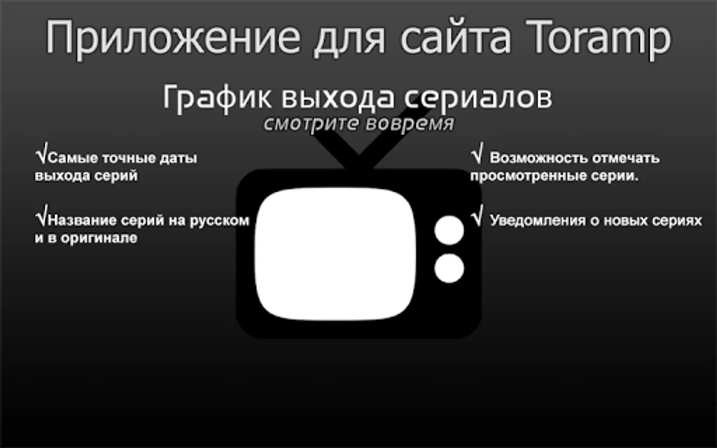 The program is an application for the site Toramp with which you can track the schedule of your favorite TV shows, and receive timely notification when a new series.