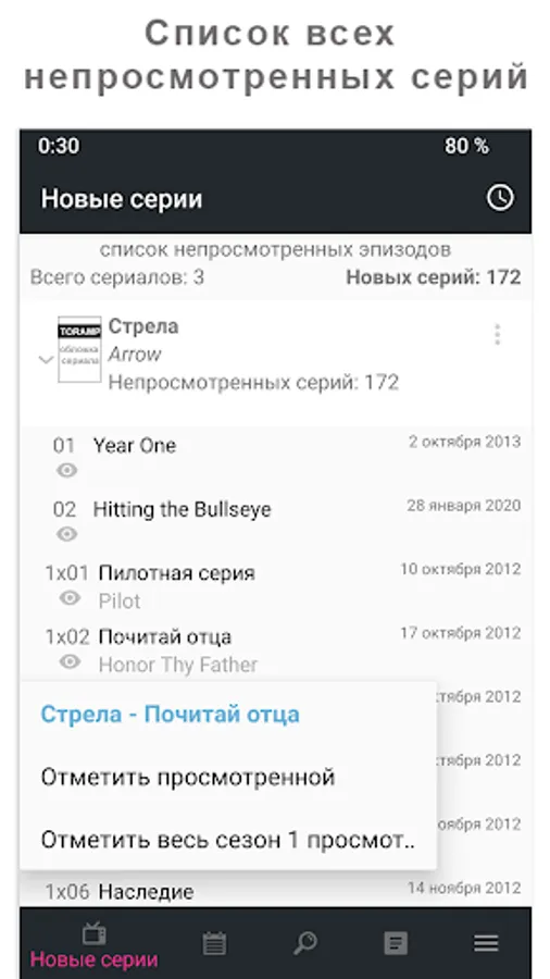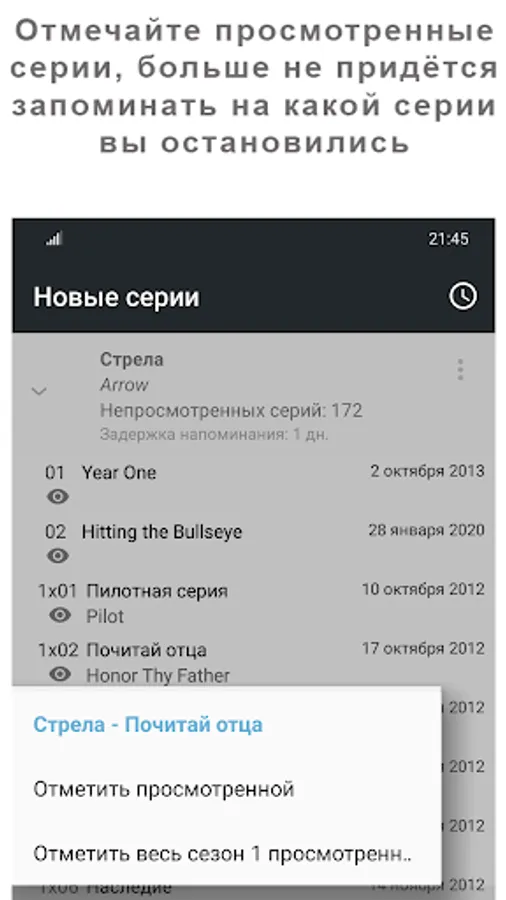 • Ability to mark viewed series. You no longer have to remember what you were watching the last series
