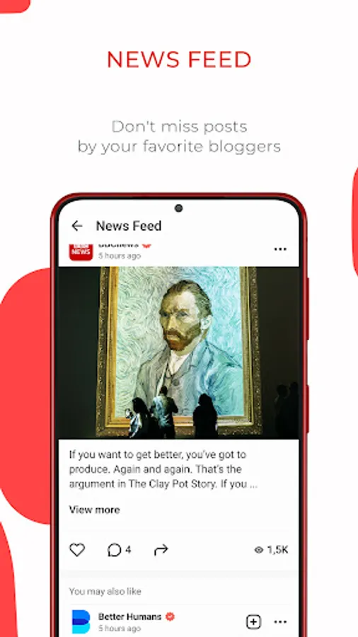 You can switch between favorite blogs with ease, or you can open the news feed in order to receive all the most recent content in one place. Simply scroll - it is endless: cool posts, articles, videos and pictures never end! The more you like, comment and subscribe, the more we learn what you enjoy. The news feed will understand you better than a close friend in matter of a week.