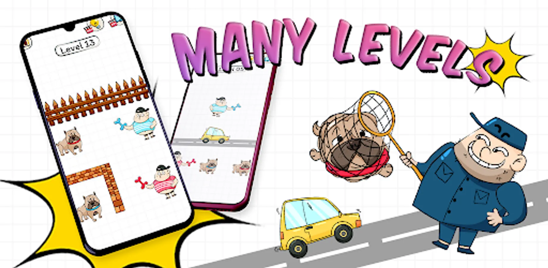 In Doge Rush: your task is to find the way for the dog to reach the bone. Draw a line to connect the dog and the mischievous child holding the bone.