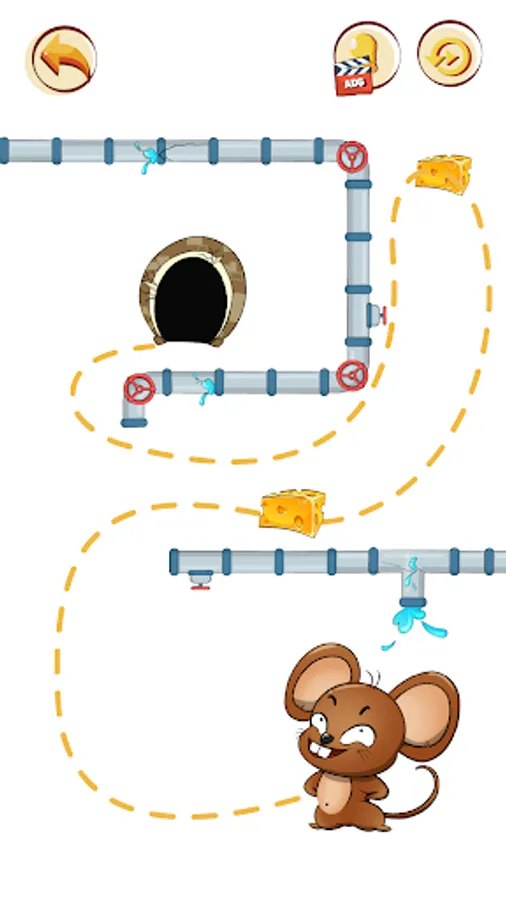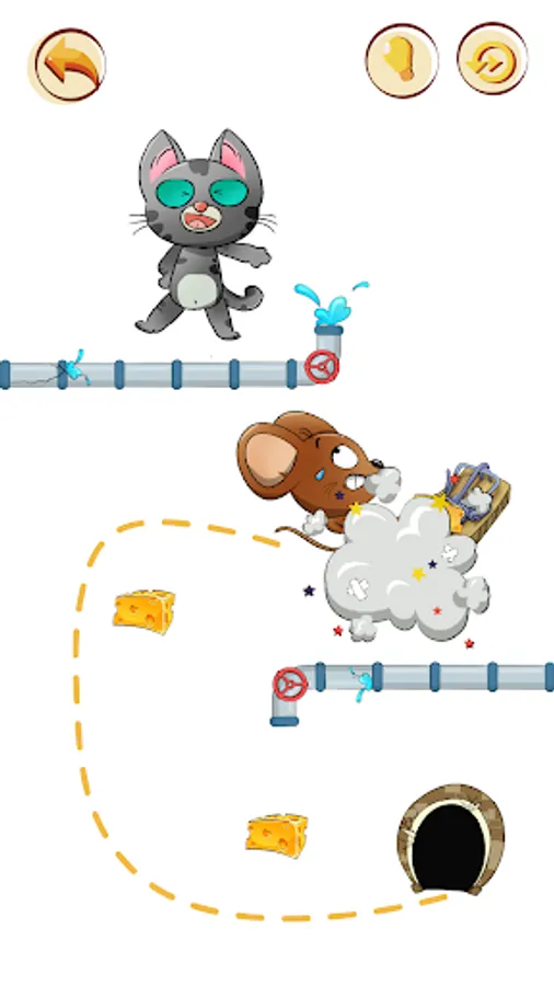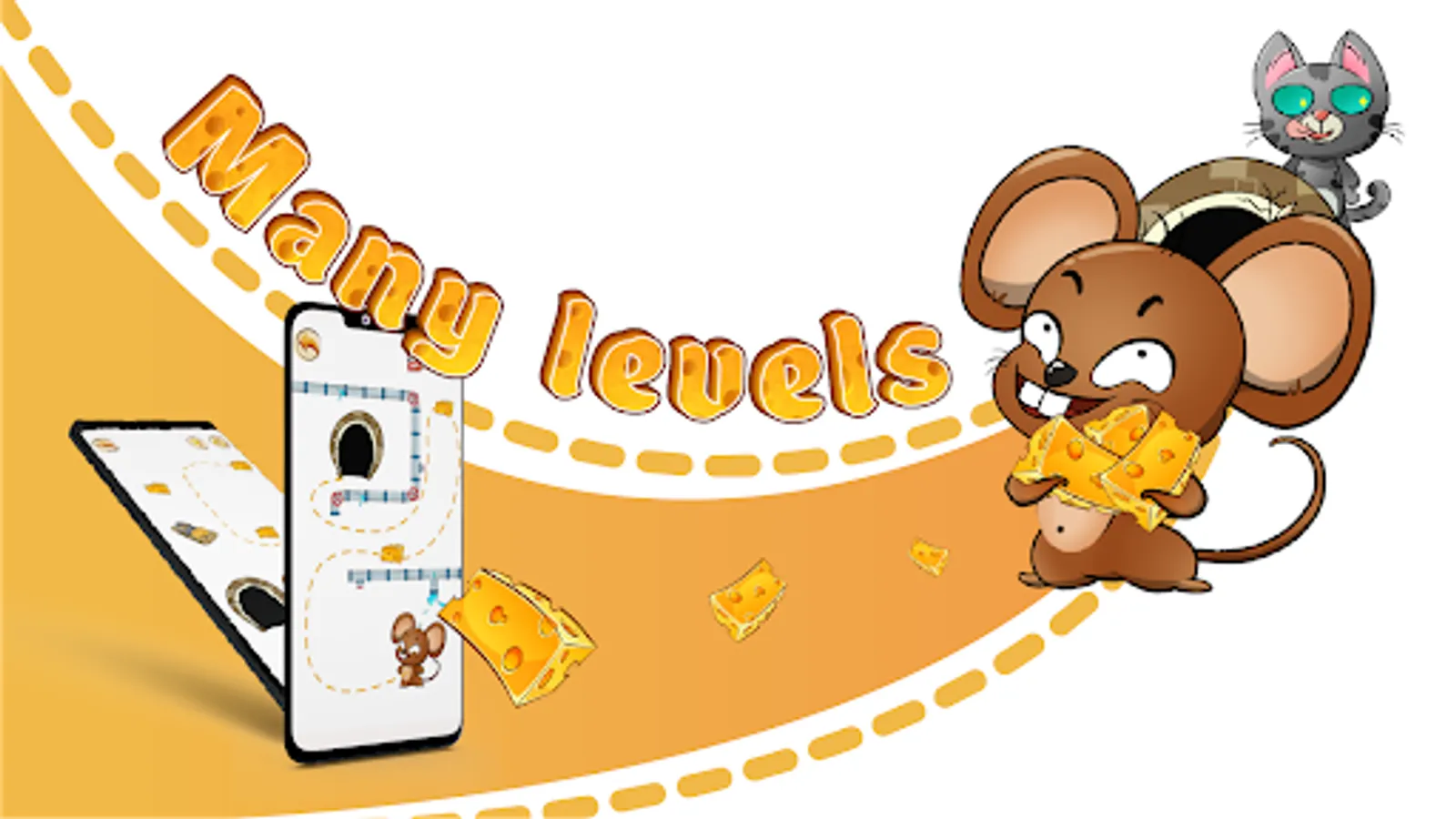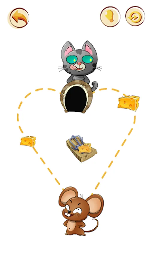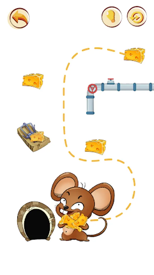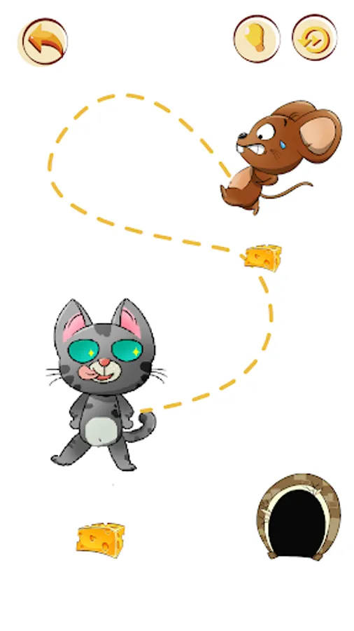 In Mouse Rush: your task is to help the mouse get the cheese and escape the cat's pursuit to return to the cave safely. Draw a line to connect the mouse to the cheese and return to the cave.