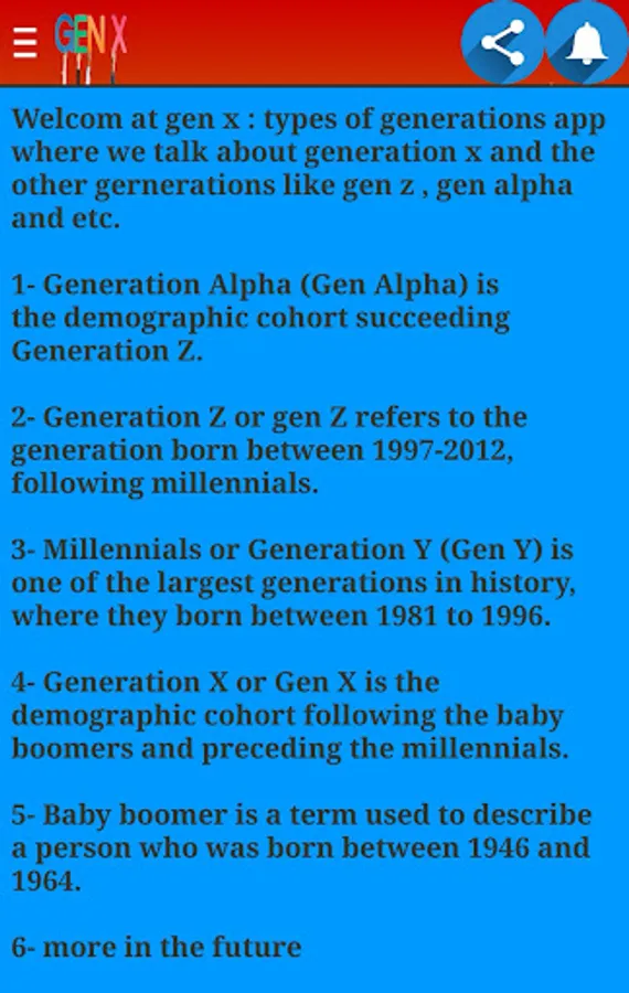 Welcom at gen x : types of generations app where we talk about generation x and the other gernerations like gen z , gen alpha and etc.