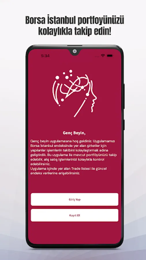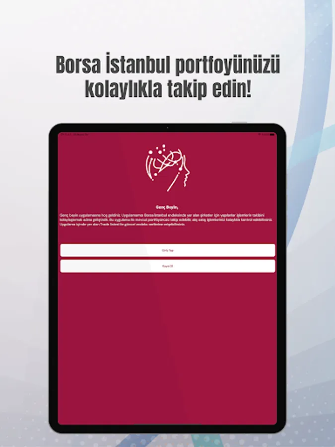 Welcome to the young brain app. We have developed our application to facilitate the follow-up of transactions made for companies in the Borsa Istanbul index. With this application, you can follow your current portfolio and easily control your buying and selling transactions.