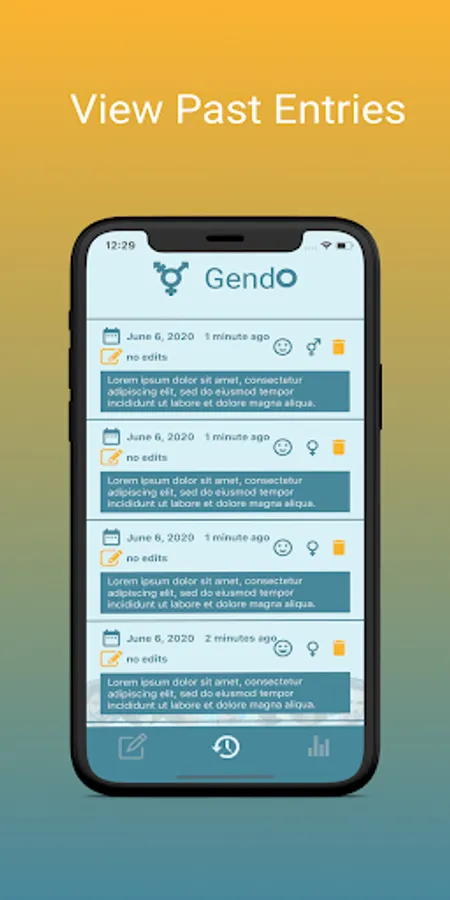 With Gendo, enjoy logging your gender, mood, and any notes that come to mind. You can view past entries, edit these past entries, and delete them as well. Your entries can also be viewed on the analytics page to allow quick and impactful analysis of your feelings and gender identity. We really hope you find that you find this app simple and helpful!