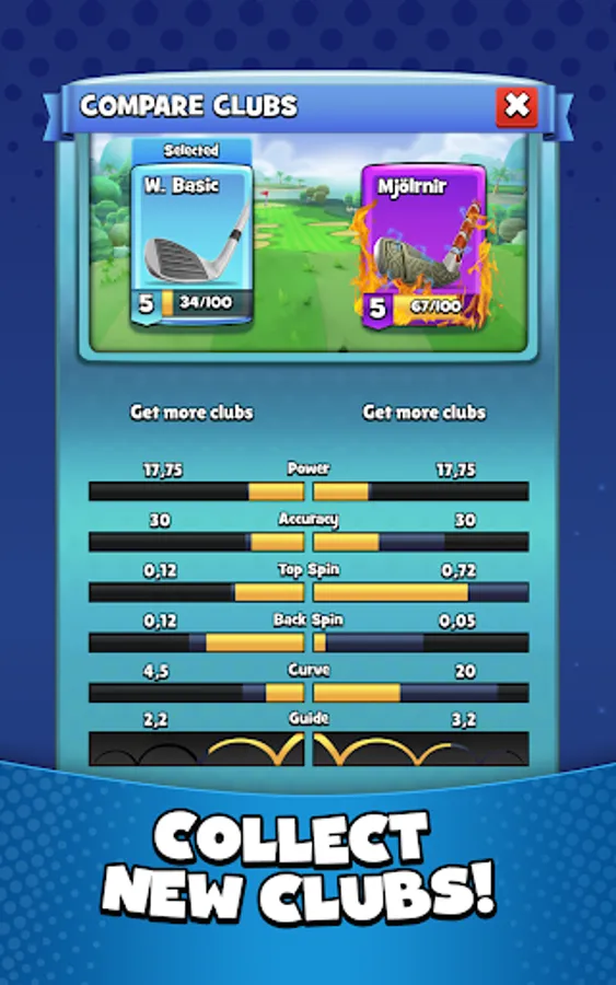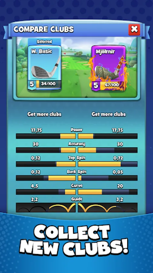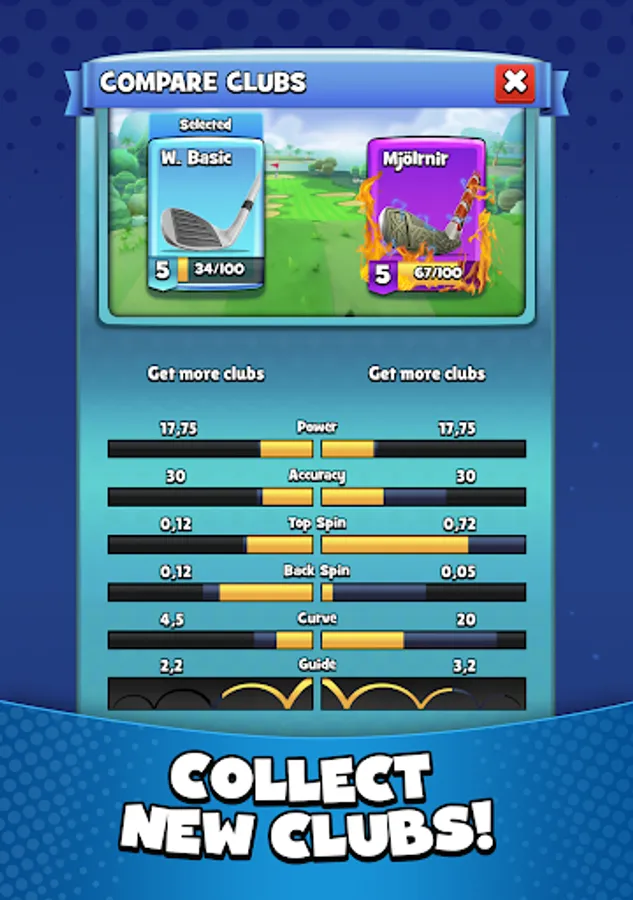 Collect new clubs! Open chests everyday and improve your Driver, Wood, Long Iron, Short Iron, Wedge, Rough Iron, Sand Wedge and Putter club to choose the perfect combo for every course.