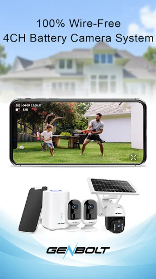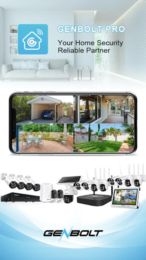 The GENBOLT PRO app is designed to work with Battery Camera and Security Camera System(4ch, 8ch, 16ch,32ch), which support Cloud P2P function. It allows you to live view your cameras remotely.