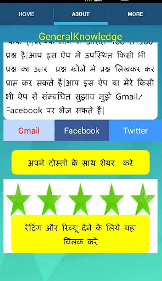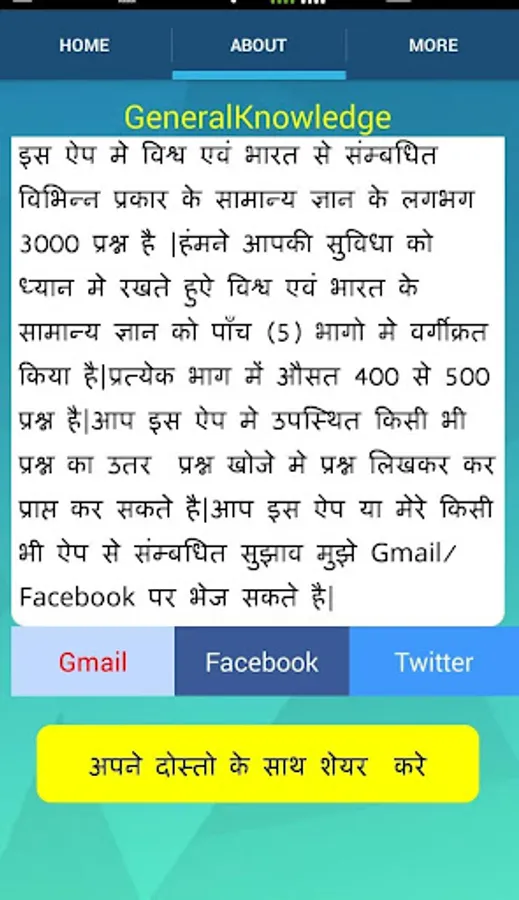publish some more apps related to different types of exam preparation.If you have any query/suggestion realted to this General Knowledge app or my other app then send me on my emailid