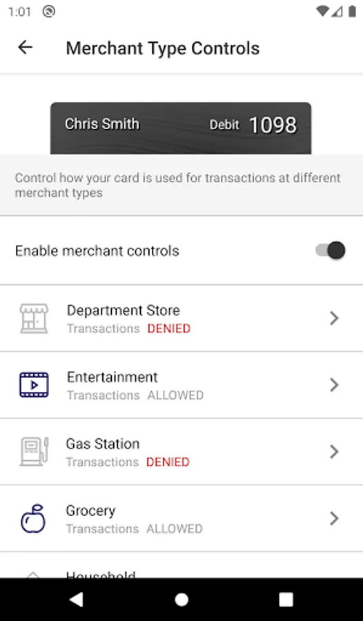 Set spending limits to decline transactions above your thresholds. Monitor activity by category such as gas stations and restaurants, and by type: in-store purchases, e-commerce transactions and ATM transactions.