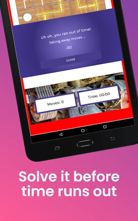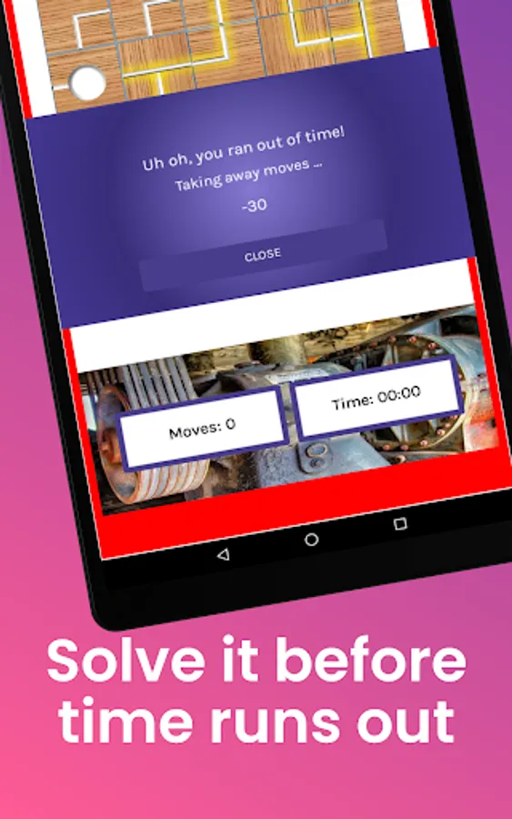 3. When only 5 seconds remain on the clock the screen flashes red and the alarm sounds. Move quickly to finish the puzzle before time runs out. At the end of the level the score is calculated, points are award for each second left on the clock, but points are taken away for each move made. You must not only light all tiles, but you must score above 0 to advance to the next level.
