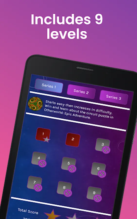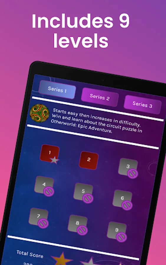 1. Each level in Otherworld: Circuit Puzzles has its own overview screen displaying the level description, score and number of awards achieved. Hit Play to launch the game and start playing.
