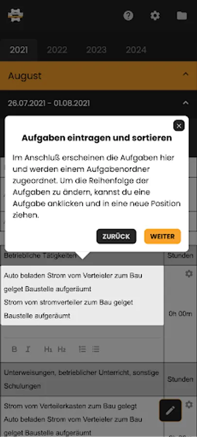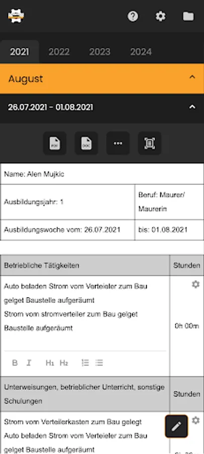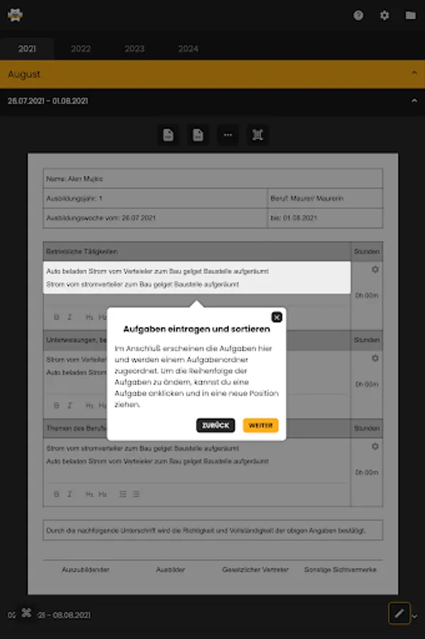 All variables such as last name, first name, report no., start/end date, year of training, etc... are automatically filled in during registration. Now all you have to do is enter the task texts.
