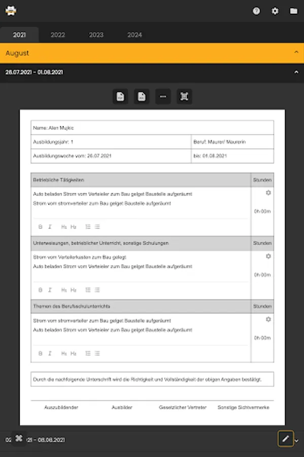 Report Book Generator is a modern report book software for the correct and orderly management of daily, weekly or monthly report books with the ability to keep all the tedious processes as short as possible. After registration, all evidence from the beginning to the end of the specified training period is automatically filled with the corresponding start and end date of the respective report. Now you can focus on the content and stop wasting time on the design.