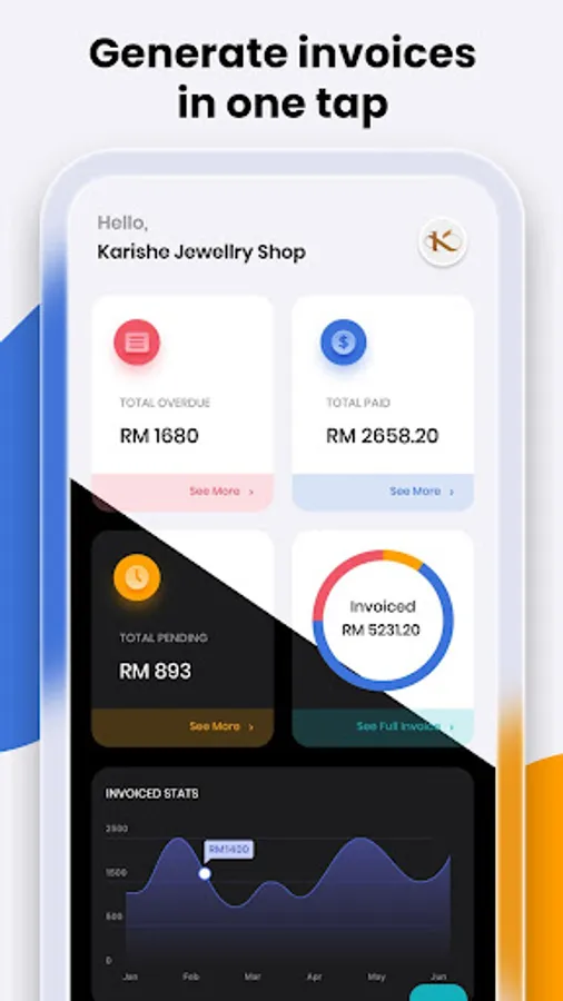 - View Pending Invoice, Overdue Invoice and Paid Invoice total amount invoices with beautifully design chart to view and understand in a glance.