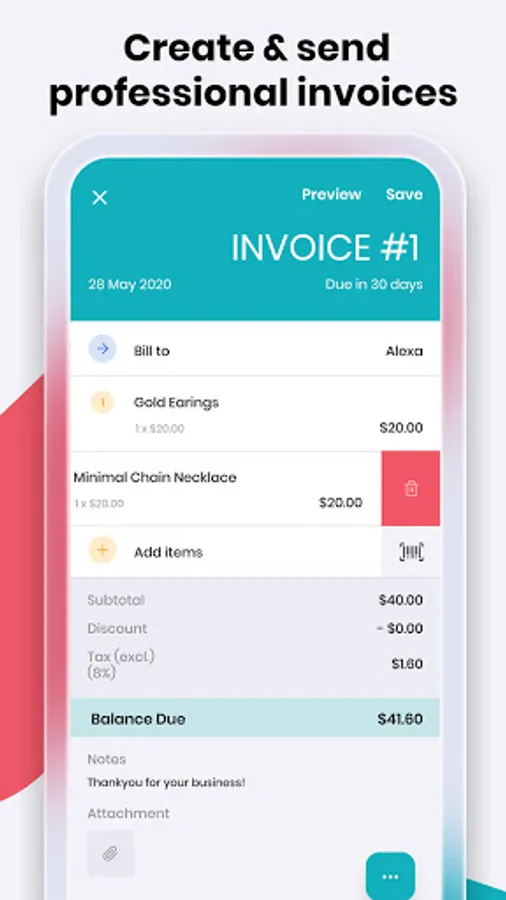 - Create and share beautiful and customizable invoice to clients with your own business logo and signature.