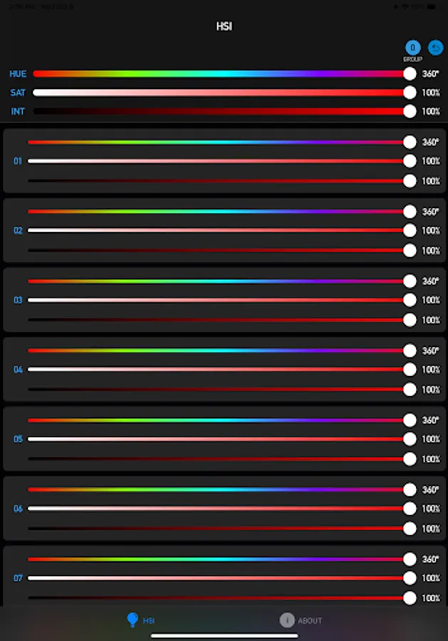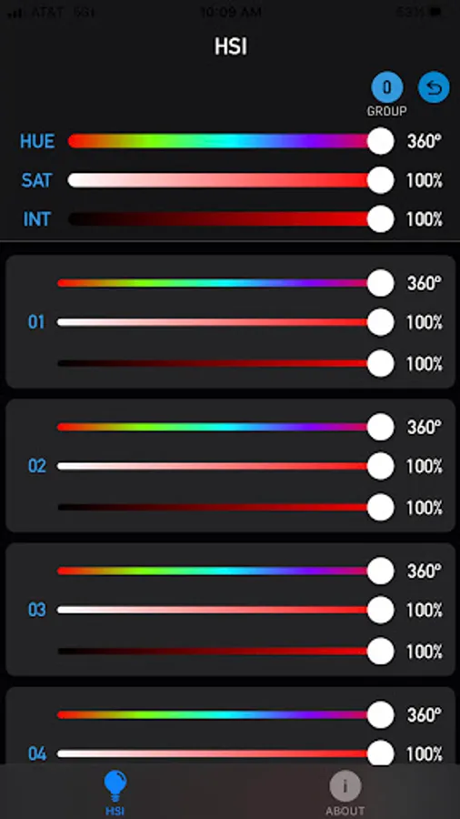 HIS Mode: Provides three sliders that let you individually set the hue, saturation level, and intensity of each light, or all lights set to the same group.