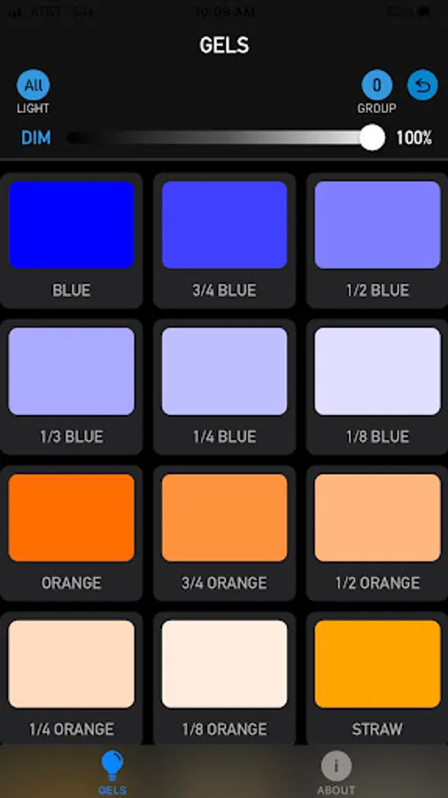 Gels Mode: Select one of 48 color gels for all lights set to the same group or each individually numbered light.