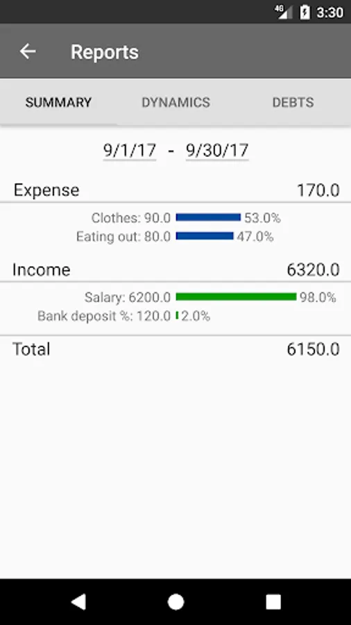 - Get statistics on each category of expenses or income, or get total statistics