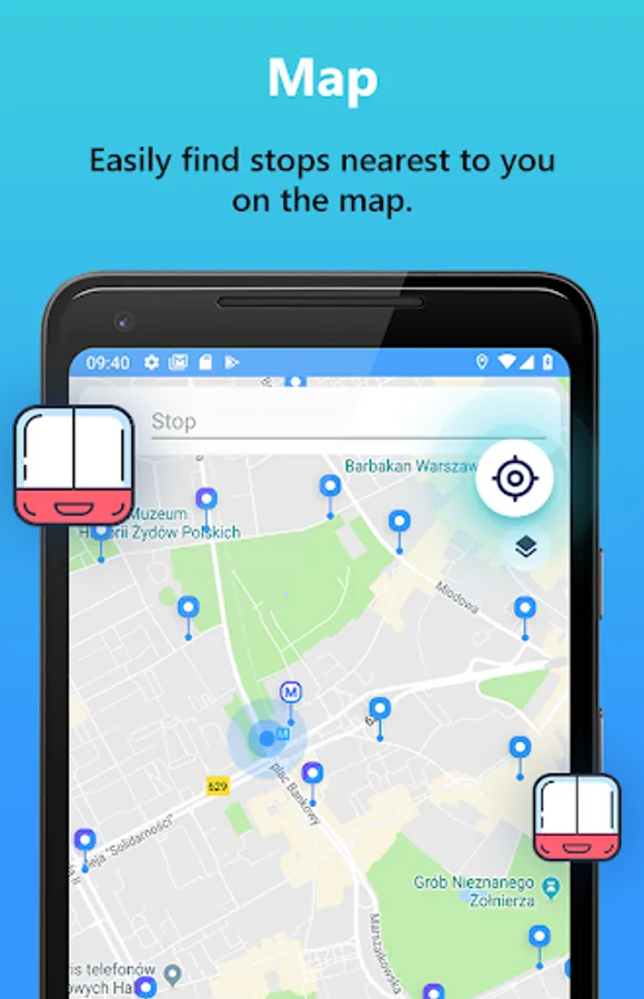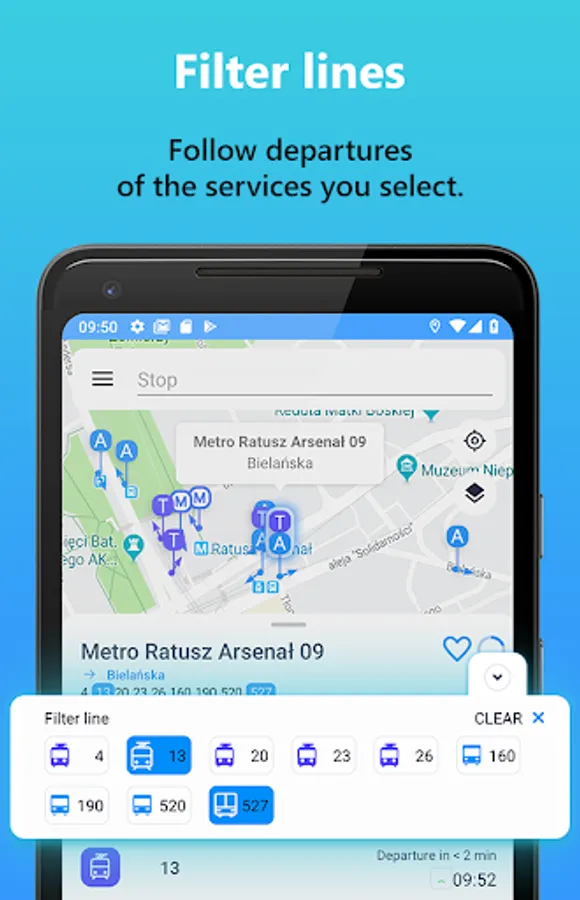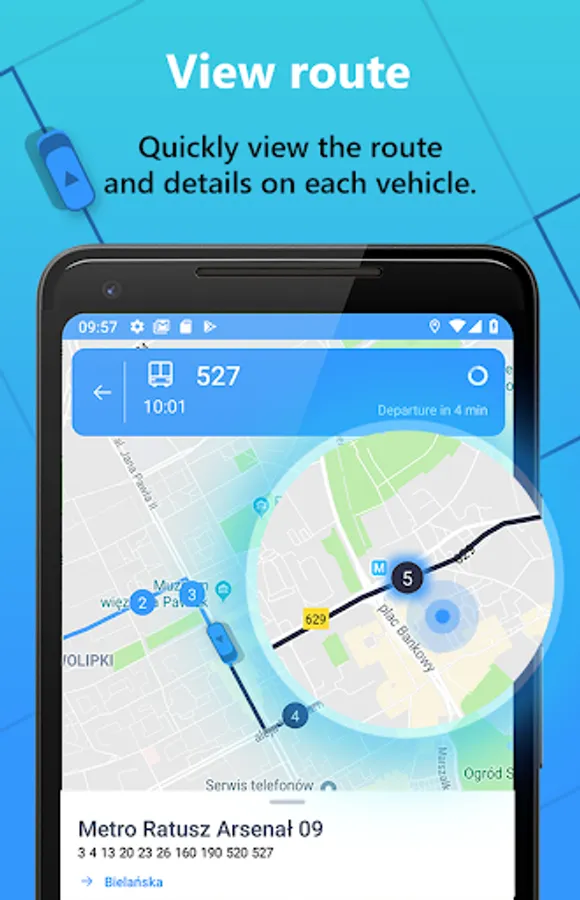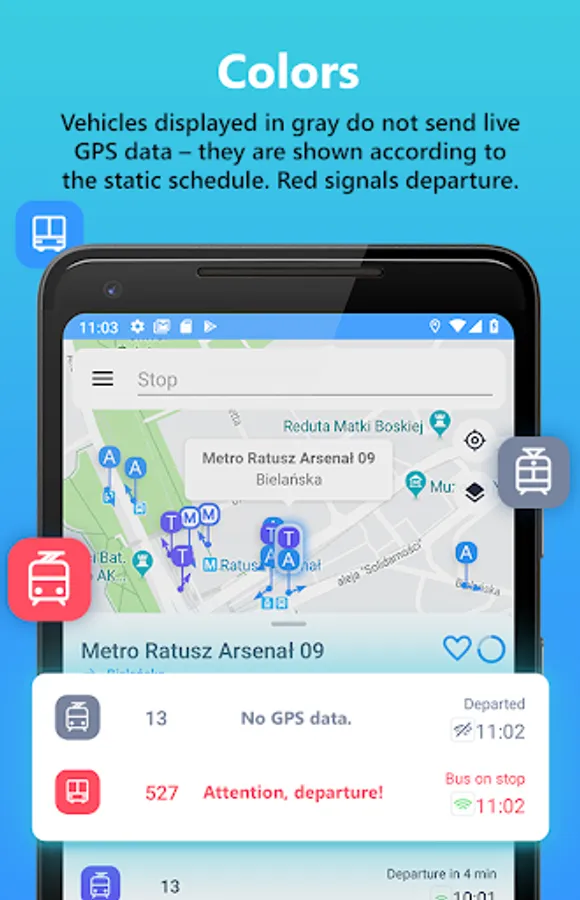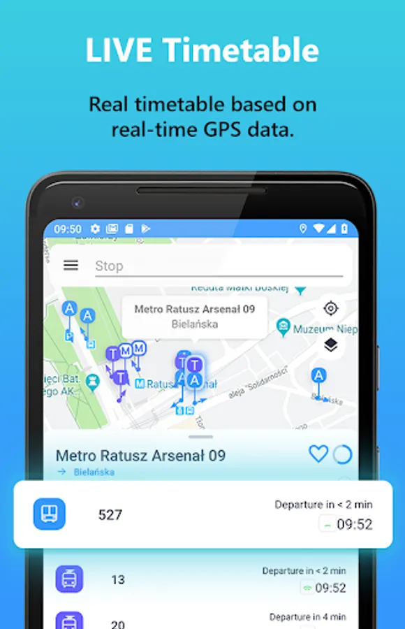 The application shows real vehicle arrivals at stops based on live GPS data, it allows you to track the position of a specific vehicle on the map in real time, check the route information of the selected service, and more.