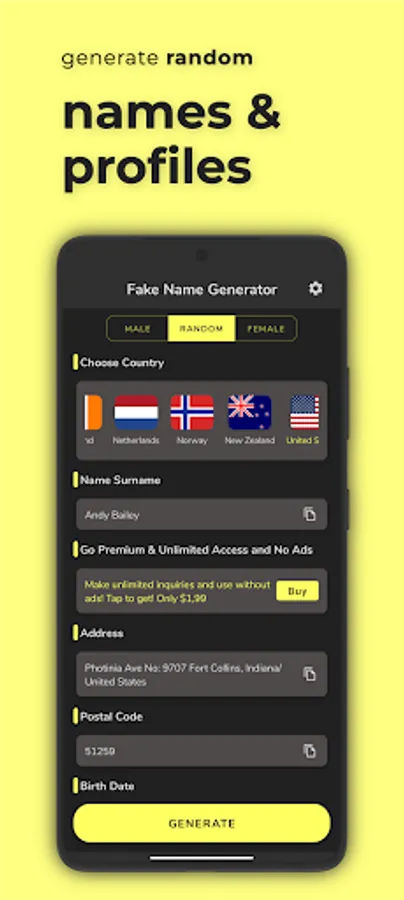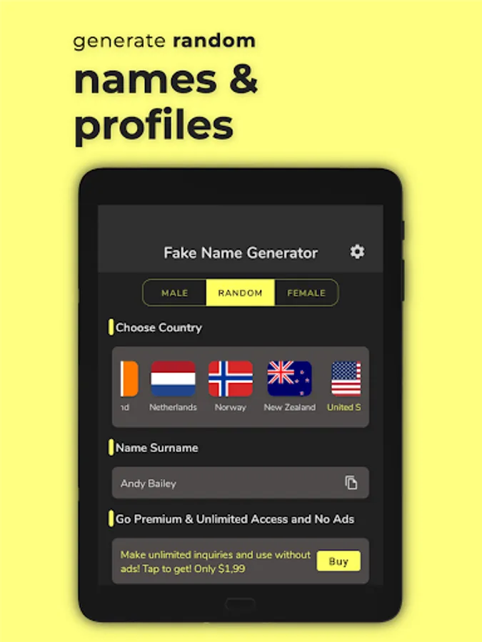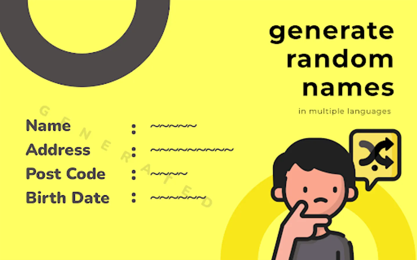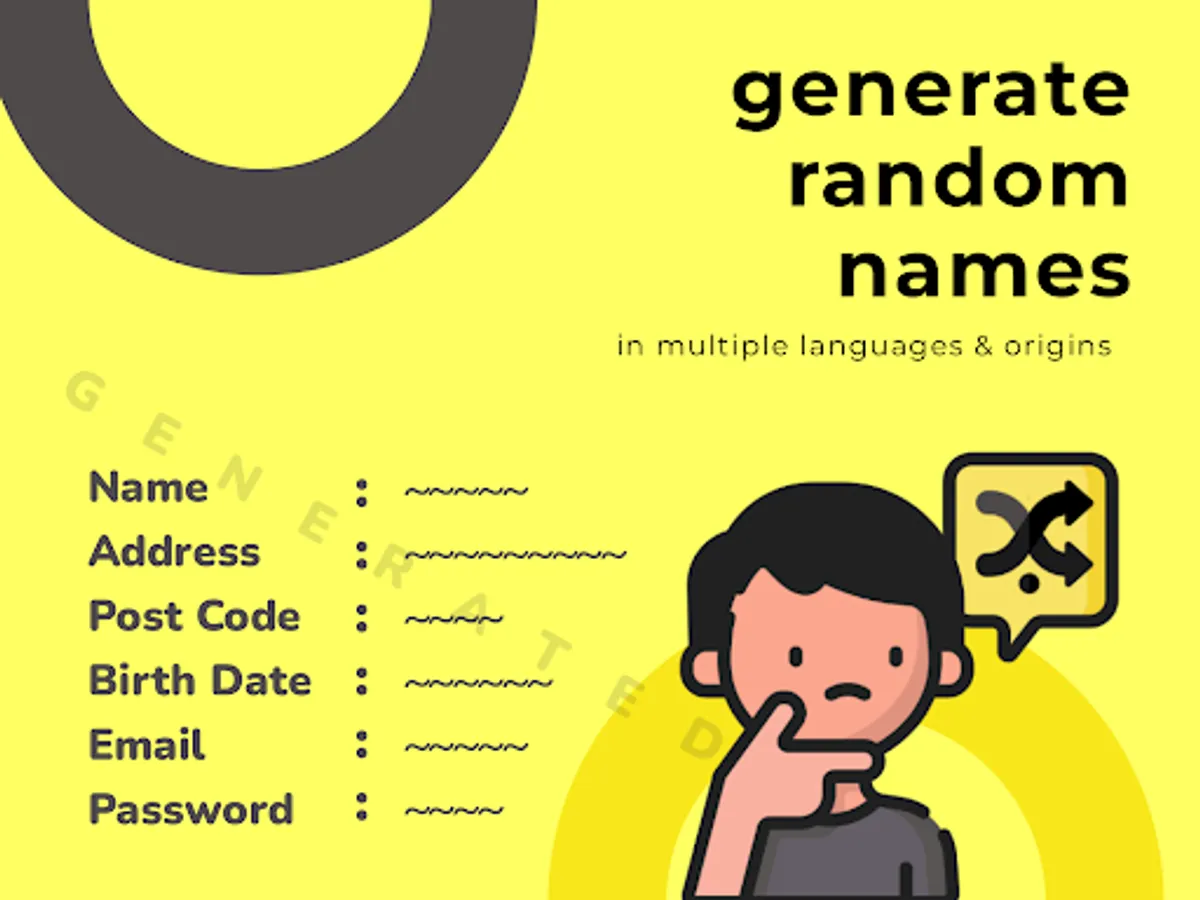 Fake name generator is completely free, all functions are available straight away after download random name picker app. Random name generator generate random & fake names from wheel of names for social dummy profiles