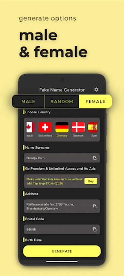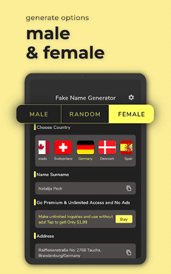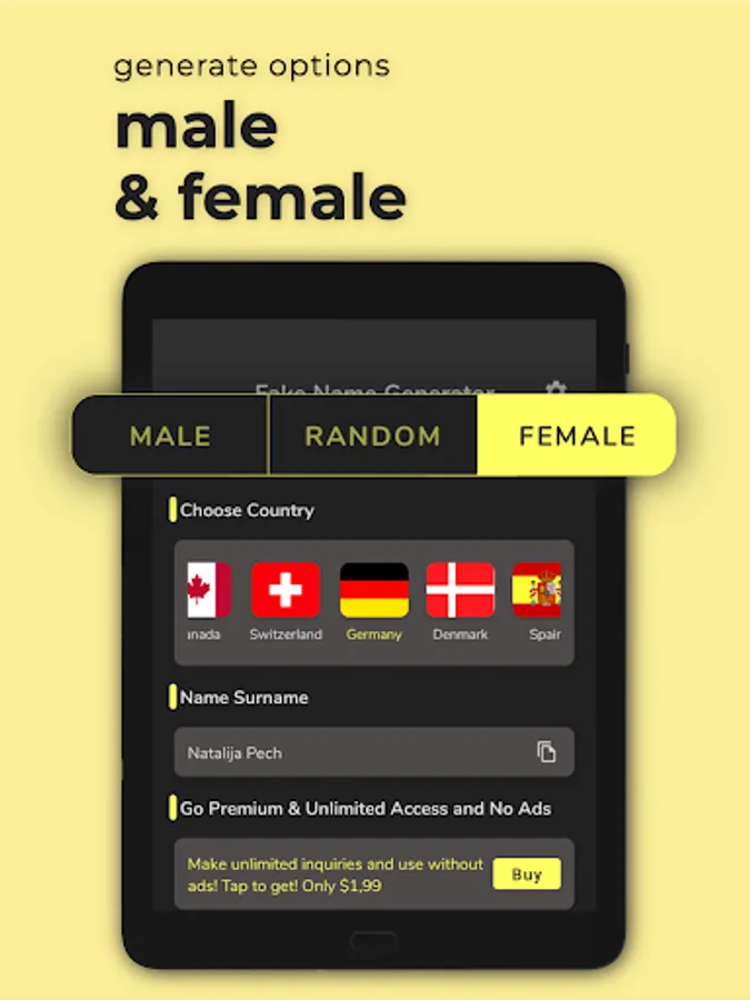 Random name generator app is companion for author who wants create fake character, journalist who wants generate nickname, uncreative person who wants unique full bio, curious person who wants to produce random name from wheel of names or just a person who needs social dummy data for create social media account. The name generator will provide you with great, authentic random real names, first and last name, from a multitude of origins on the globe. You can easily choose to generate female or male names and social dummy info after you have chosen the origin in a clean and simple user interface of random name picker.