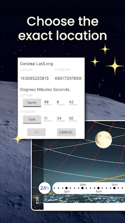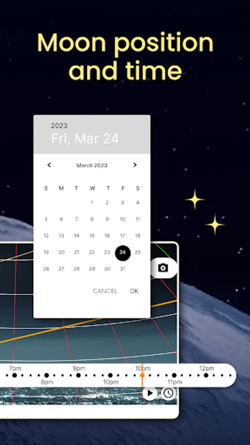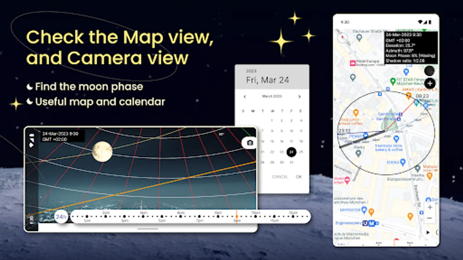 👉 Augmented Reality (AR) feature displays the moon phase directly overlaid on your device's camera. Use the slider to set the time of day and directly track the lunar movement. [A device with a magnetometer (compass) is needed to use the AR feature].
