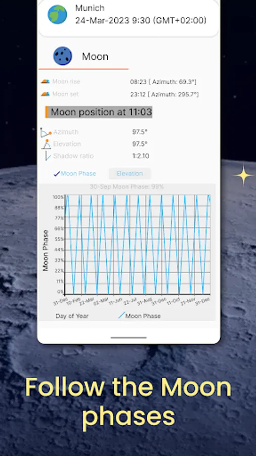 👉 Moon calendar Main View displays all the detailed information: the lunar rise and moonset, moon phases (waning and waxing, in percentages), and more. The moon tracker graph displays the moon phases over a year.