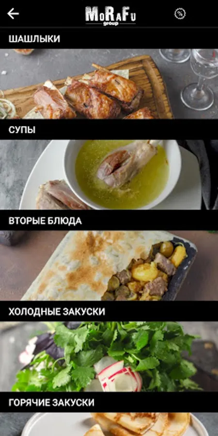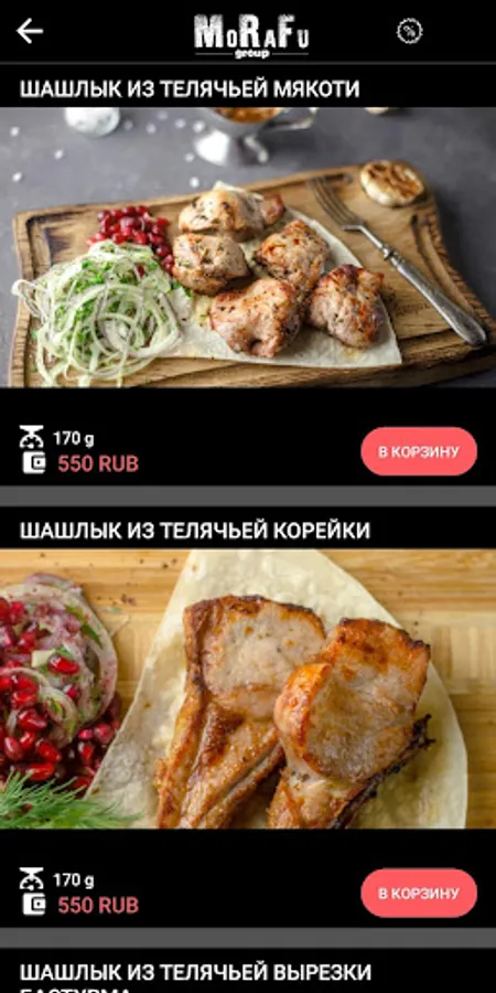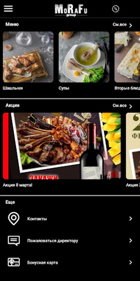 Mobile applications for the MoRaFu group gives you the opportunity to use a discount card in restaurants of the network, as well as a bonus card upon delivery.