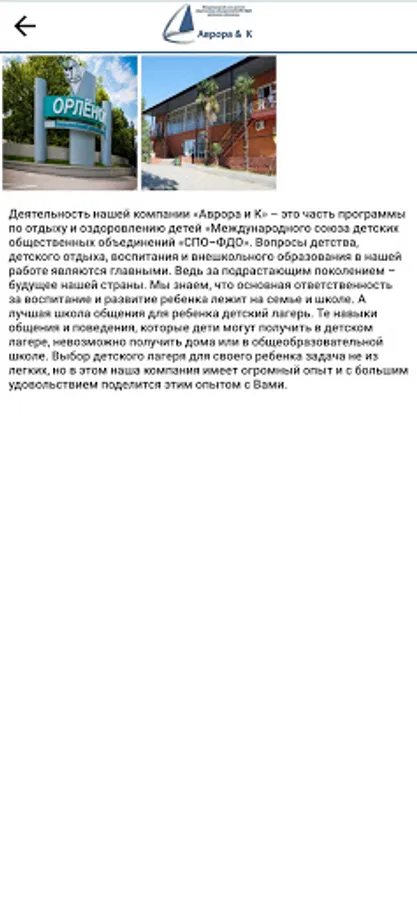 Деятельность нашей компании «Avrora camps» – это часть программы по отдыху и оздоровлению детей «Международного союза детских общественных объединений «СПО-ФДО». Вопросы детства, детского отдыха, воспитания и внешкольного образования в нашей работе являются главными. Ведь за подрастающим поколением – будущее нашей страны. Мы знаем, что основная ответственность за воспитание и развитие ребенка лежит на семье и школе. А лучшая школа общения для ребенка детский лагерь. Те навыки общения и поведения, которые дети могут получить в детском лагере, невозможно получить дома или в общеобразовательной школе. Выбор детского лагеря для своего ребенка задача не из легких, но в этом наша компания имеет огромный опыт и с большим удовольствием поделится этим опытом с Вами.