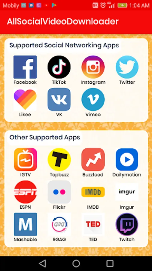 Instagram,twitter,TikTok,FaceBook,Likee,VK,Vimeo,IGTV,TopBuzz,Buzzfeed,DailyMotion,ESPN,Flicker,IMDB,Imgur,Mashable,9Gag,TED,Twitch,Tumblr,Roposo,ShareChat,SnackVideo