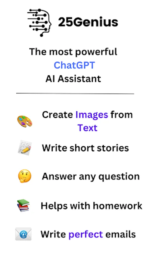 Get AI superpowers with 25Genius - powerful chat AI app that leverages GPT 4, ChatGPT and DALLE to help you with mundane tasks.