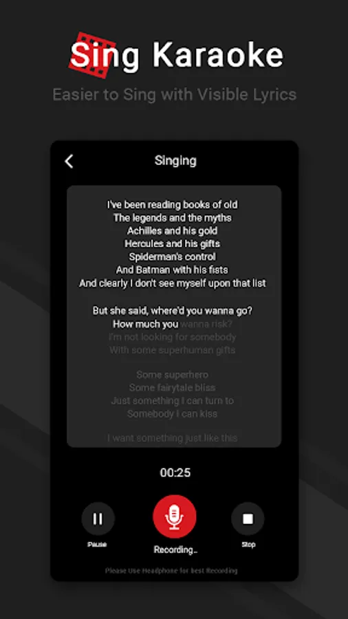 Karaoke One lyrics and songs, MP3 music, share your video with karaoke lyrics in app, thanks to a karaoke social network with song lyrics.