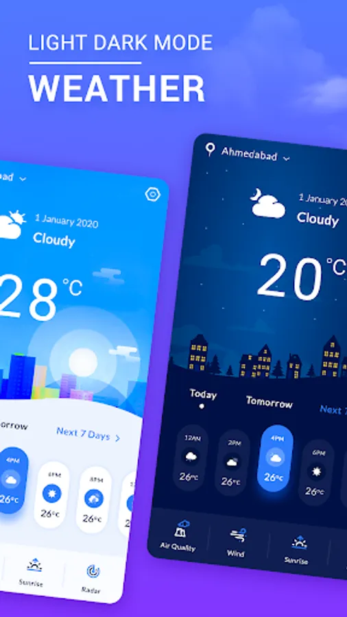 In this daily and hourly weather app, you can get more than just temperatures and clock. You can check humidity, visibility, UV index, air pressure, wind speed, sunrise time, sunset time in different units.