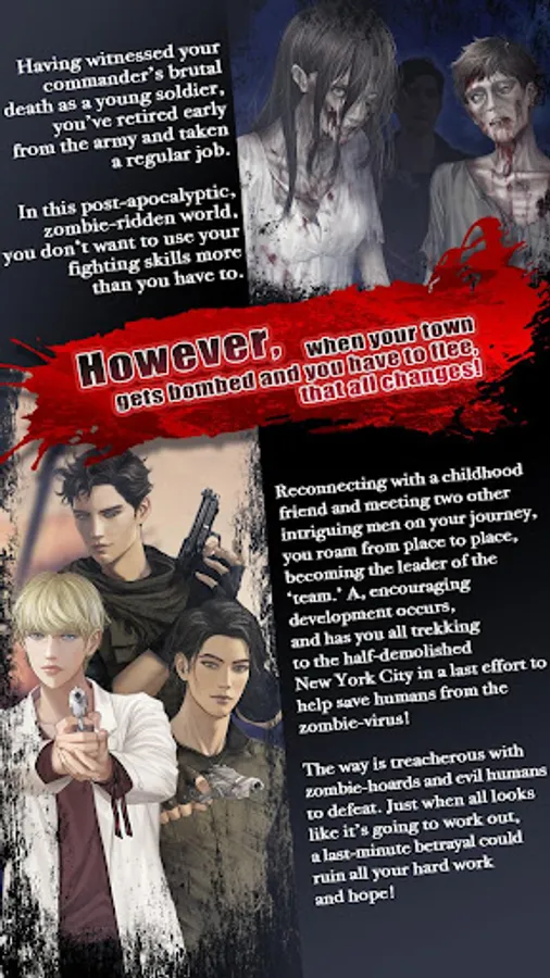 **You become the beautiful, tenacious and fierce heroine in this romantic interactive novel involving a post-apocalyptic world, zombies and, of course, three gorgeous men who are into you!