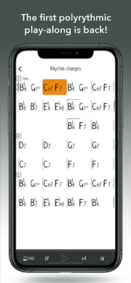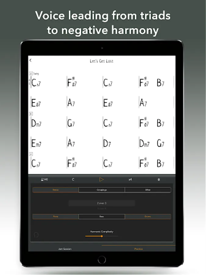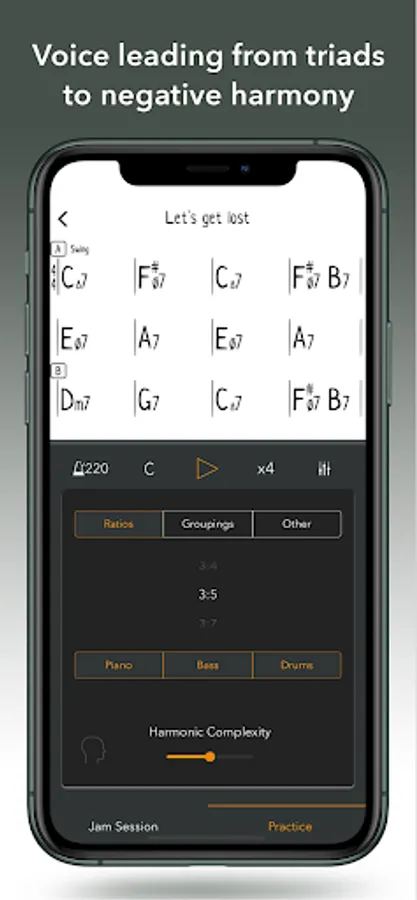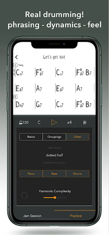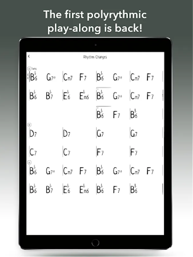 No pre-recorded phrases, no repetition. The polyrhythmic phrasing and the natural bright and open sound of a jazz trio accompaniment set you up for a unique practice session.