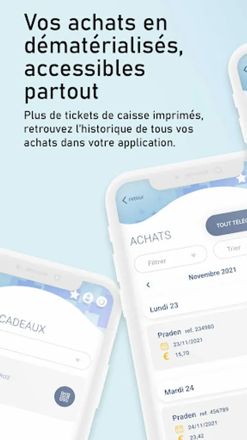 Your purchases in dematerialized, accessible everywhere. No more printed receipts, find the history of all your purchases in your application.
