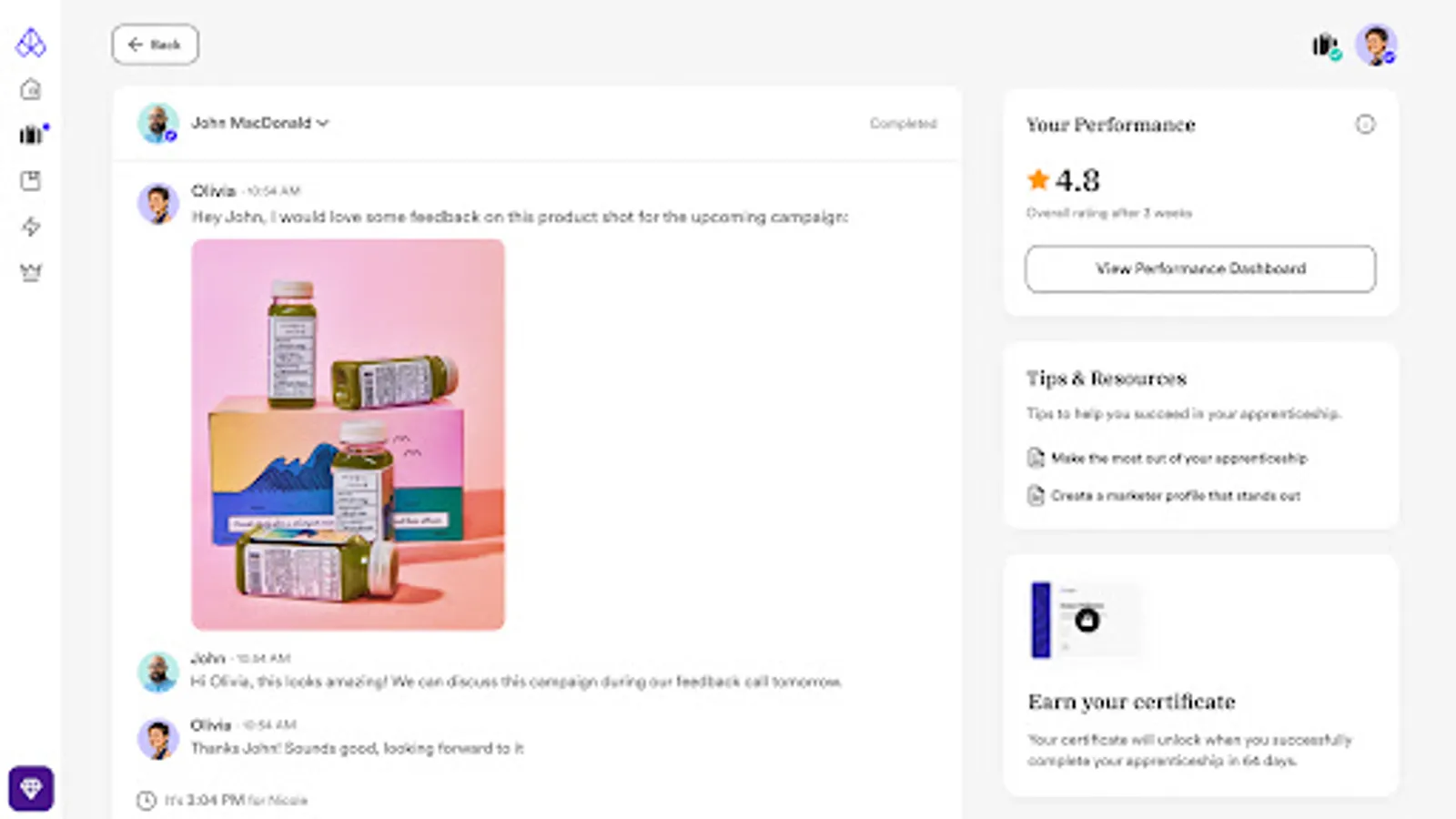Upon completing an apprenticeship you earn a marketing certification and a letter of reference from your mentor. 55% of apprenticeships lead to a hiring relationship.