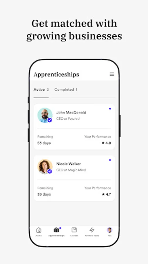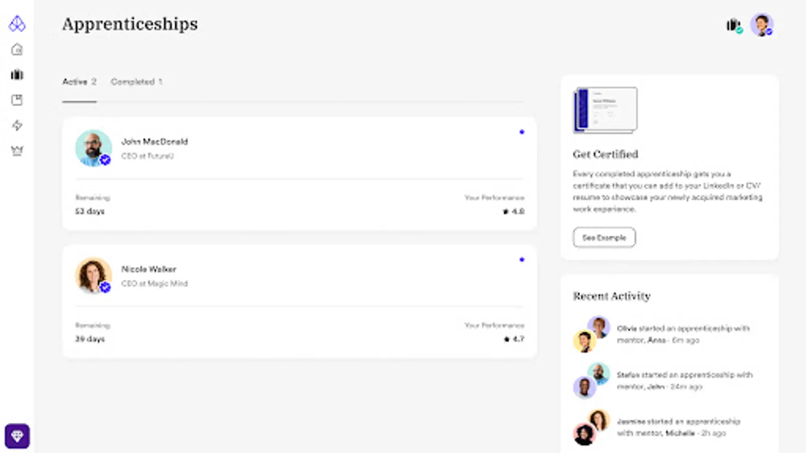 When you are ready you can start an apprenticeship working directly with a mentor (business owner). An apprenticeship is 10 hours a week for 3 months and 100% remote. Apprenticeships enable you to build real work experience, confidence and a network.