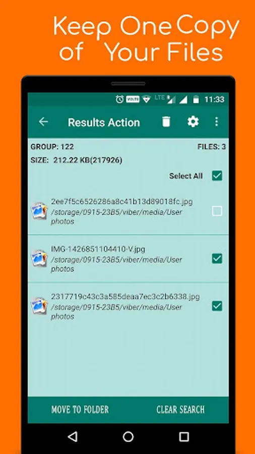 This feature keeps one copy of your duplicate files and gives you the chance of removing all the duplicate photos with just one click. This has yet to be implemented.