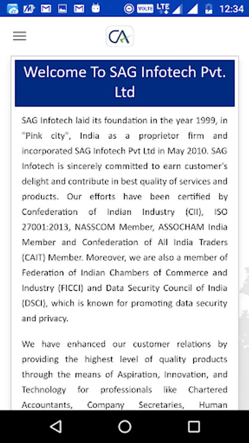 SAG Infotech laid its foundation in the year 1999, in "Pink city", India as a proprietor firm and incorporated SAG Infotech Pvt Ltd in May 2010. SAG Infotech is sincerely committed to earn customer's delight and contribute in best quality of services and products. Our efforts have been certified by Confederation of Indian Industry (CII), ISO 27001:2013, NASSCOM Member, ASSOCHAM India Member and Confederation of All India Traders (CAIT) Member. Moreover, we are also a member of Federation of Indian Chambers of Commerce and Industry (FICCI) and Data Security Council of India (DSCI), which is known for promoting data security and privacy.