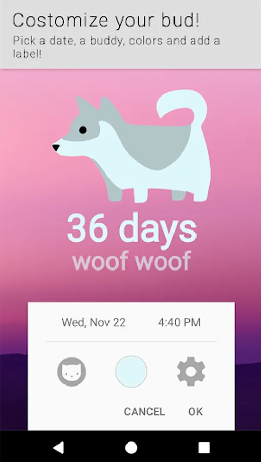 Enter the date, choose from a variety of customizable buddies, find a spot on the home screen for your buddy to remind you about exciting things to come.