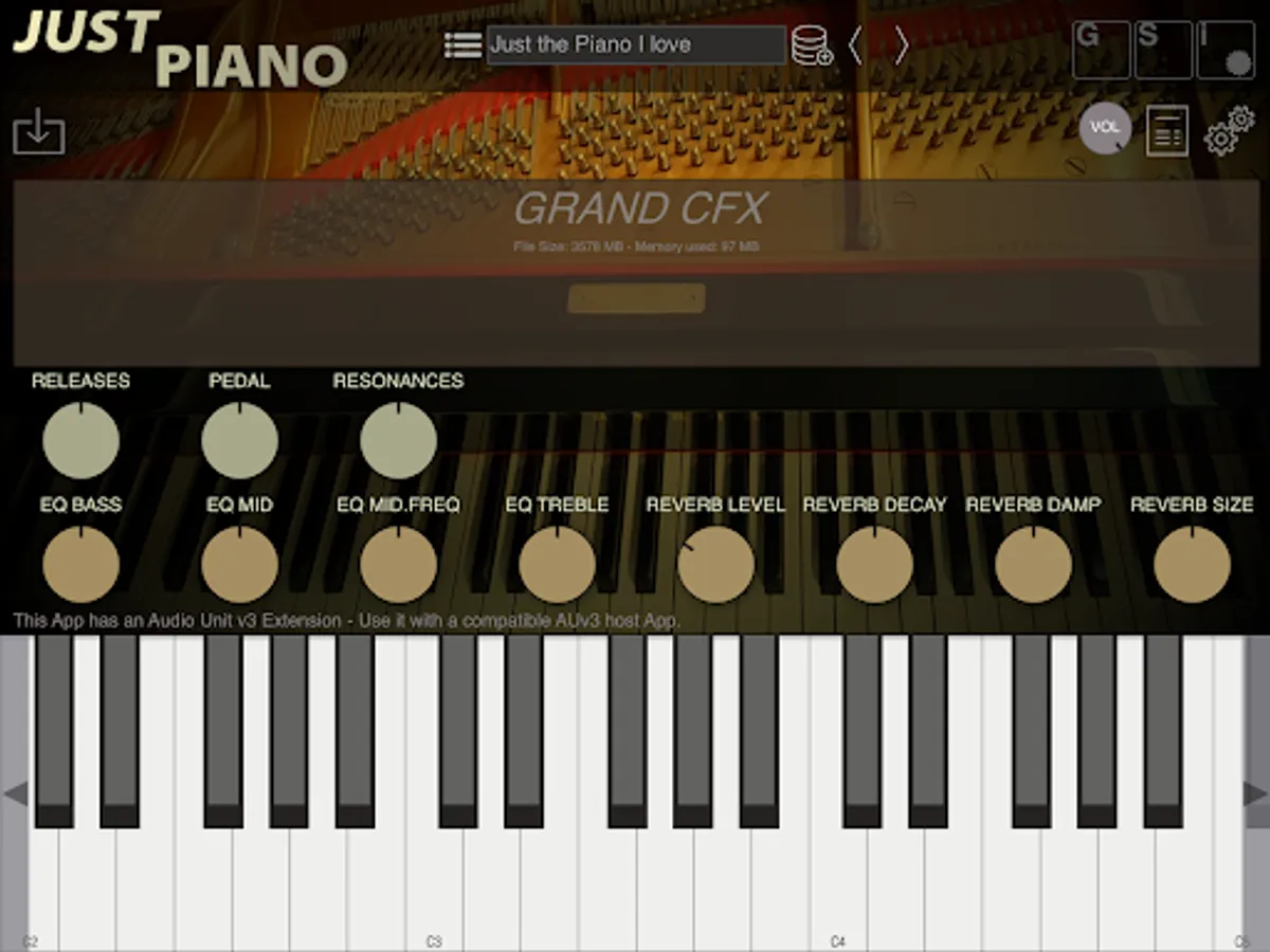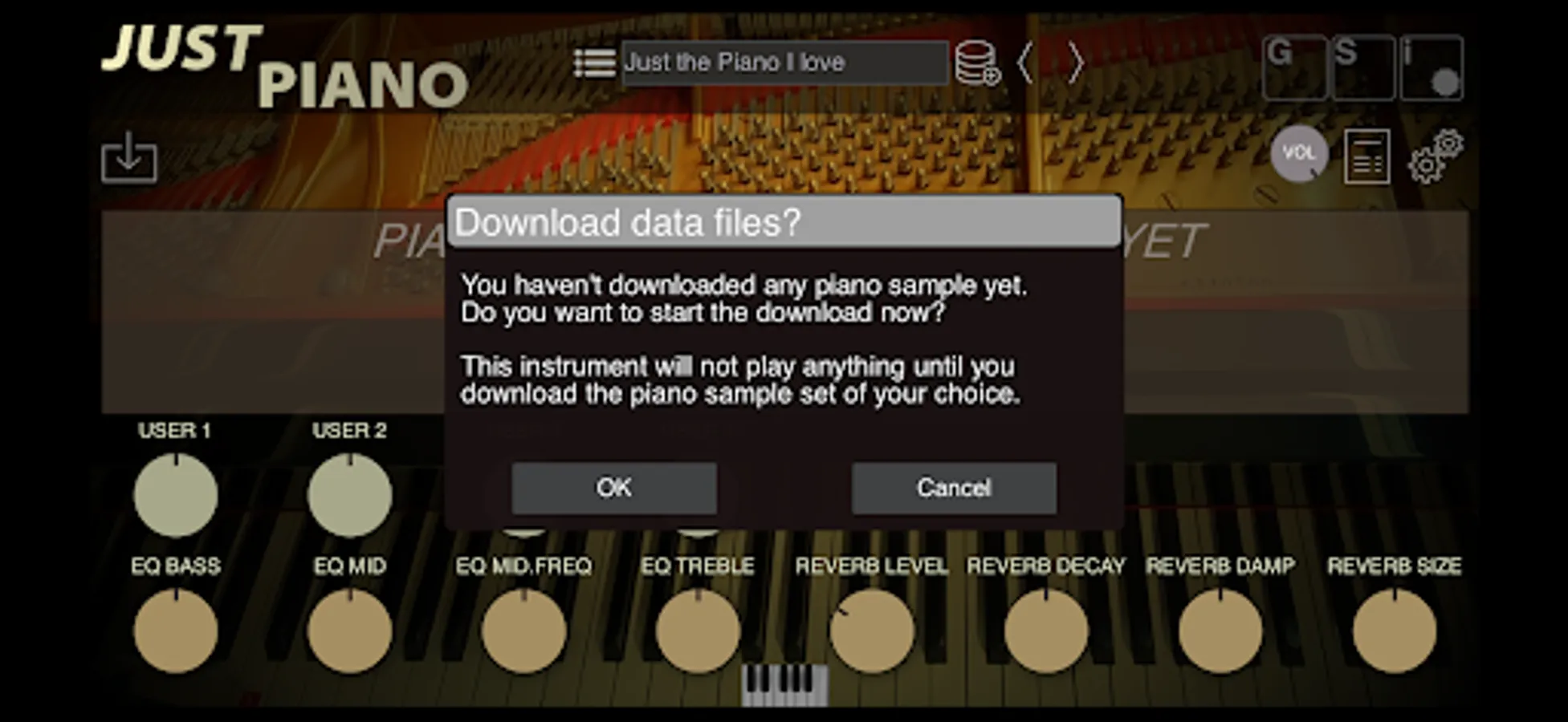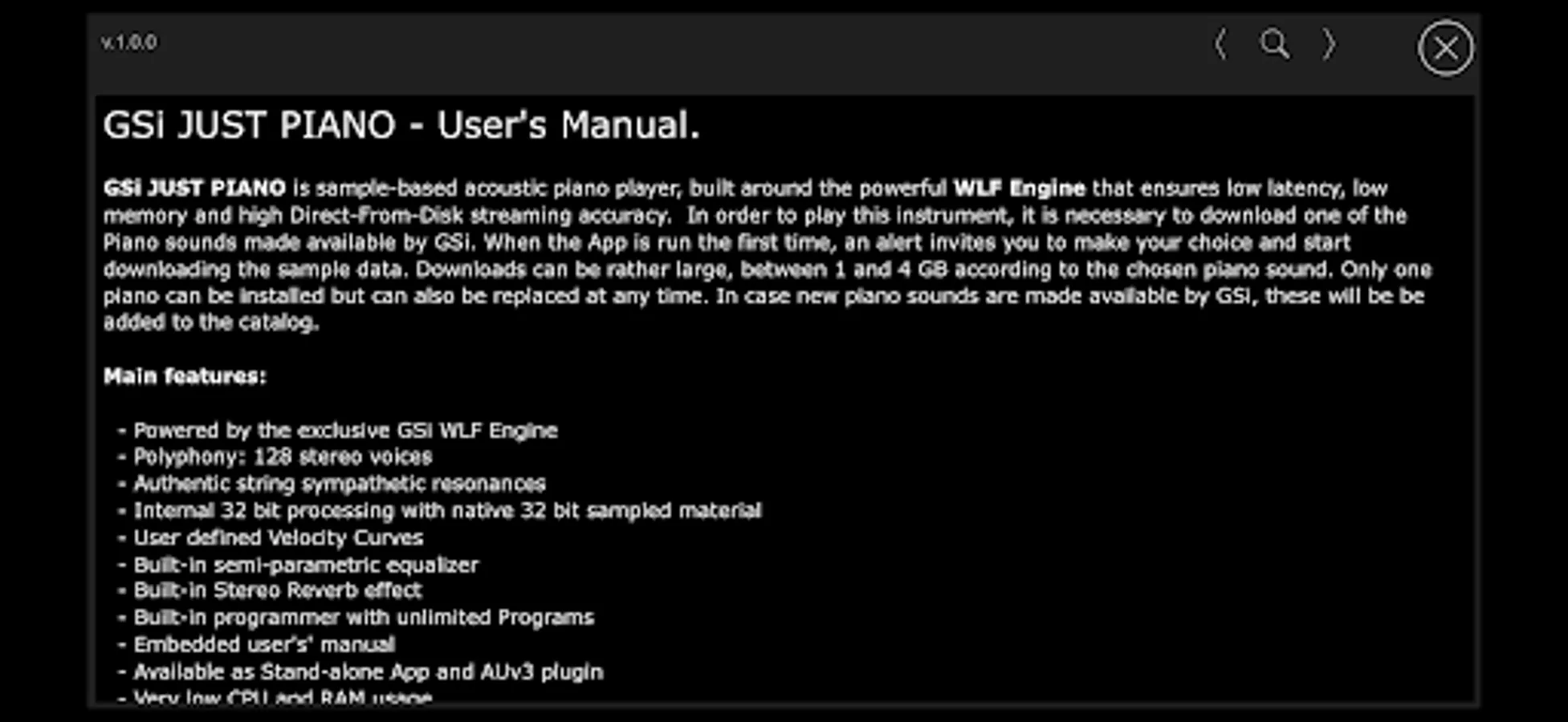 GSi JUST PIANO is a sample-based acoustic piano player, built around the powerful WLF Engine that ensures low latency, low memory and high Direct-From-Disk streaming accuracy. In order to play this instrument, it is necessary to download one of the Piano sounds made available by GSi. When the App is run for the first time, an alert invites you to make your choice and start downloading the sample data. Downloads can be rather large, between 1 and 2 GB according to the chosen piano sound. Only one piano can be installed but can also be replaced at any time. In case new piano sounds are made available by GSi, these will be be added to the catalog.