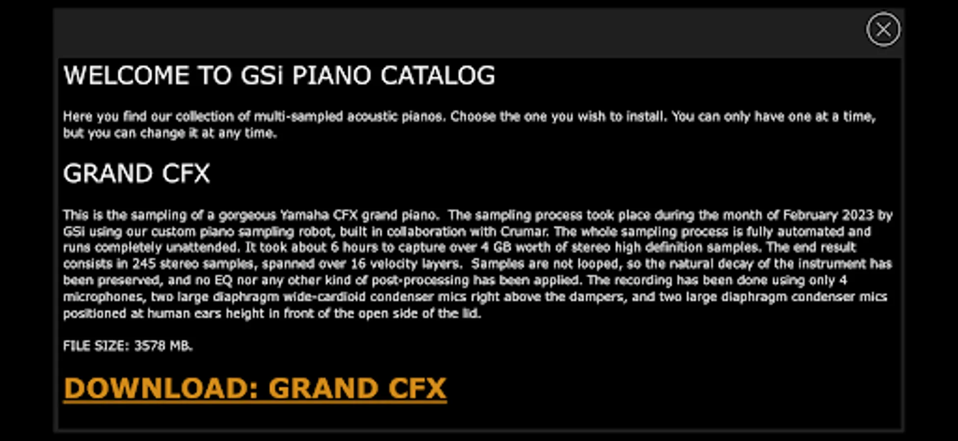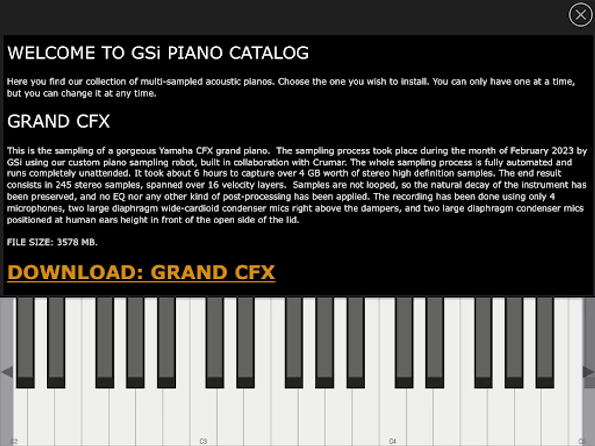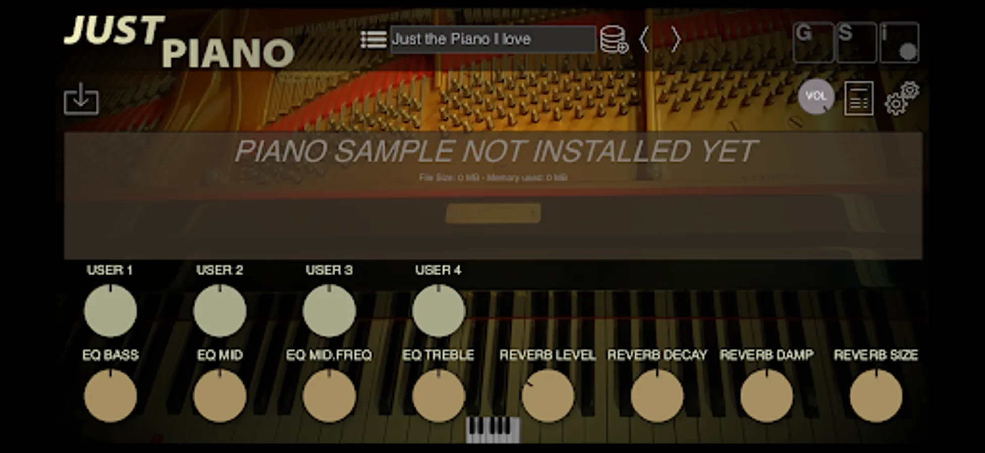 GSi JUST PIANO is a sample-based acoustic piano player, built around the powerful WLF Engine that ensures low latency, low memory and high Direct-From-Disk streaming accuracy. In order to play this instrument, it is necessary to download one of the Piano sounds made available by GSi. When the App is run for the first time, an alert invites you to make your choice and start downloading the sample data. Downloads can be rather large, between 1 and 2 GB according to the chosen piano sound. Only one piano can be installed but can also be replaced at any time. In case new piano sounds are made available by GSi, these will be be added to the catalog.